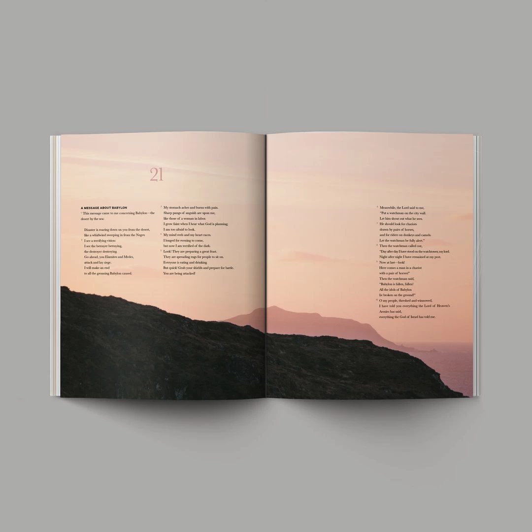 Design aspects: This book is softcover, 232 pages, perfect bound, and printed in full color on uncoated paper in Canada. The dimensions are 7.5 in x 9.5 in. NLT translation.