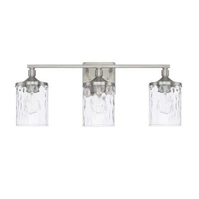 3 light vanity with brushed nickel finish and clear water glass. Also available in Aged Brass, Matte Black and Bronze.