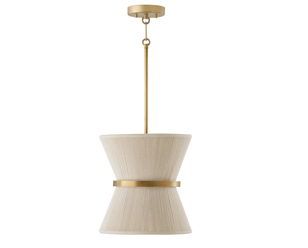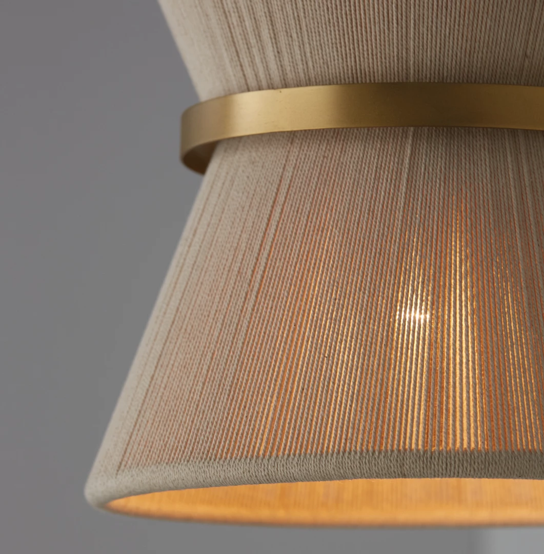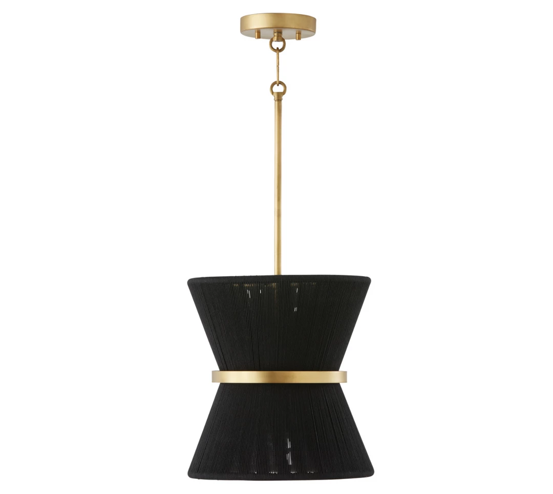 The classic shape of the Kylo 1-Light Pendant is reminiscent of old Hollywood style. The honey-toned, patina Brass band accentuates the artisan loomed hourglass silhouette made of black rope for eye-catching elegance. Also available in bleached rope