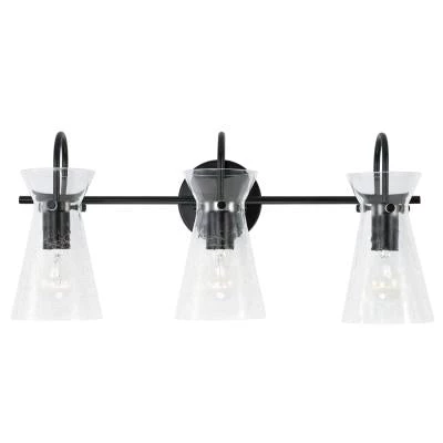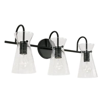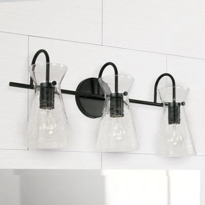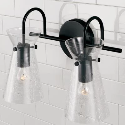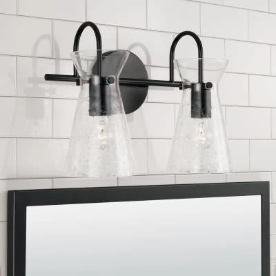 Uniquely shaped crackle glass sets the vanity light apart. Matte black is a stunning finish with a softer gold appearance.