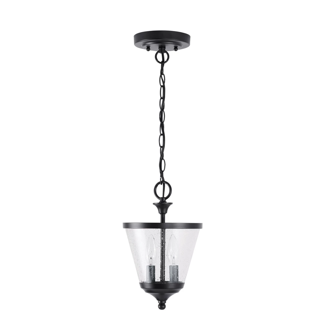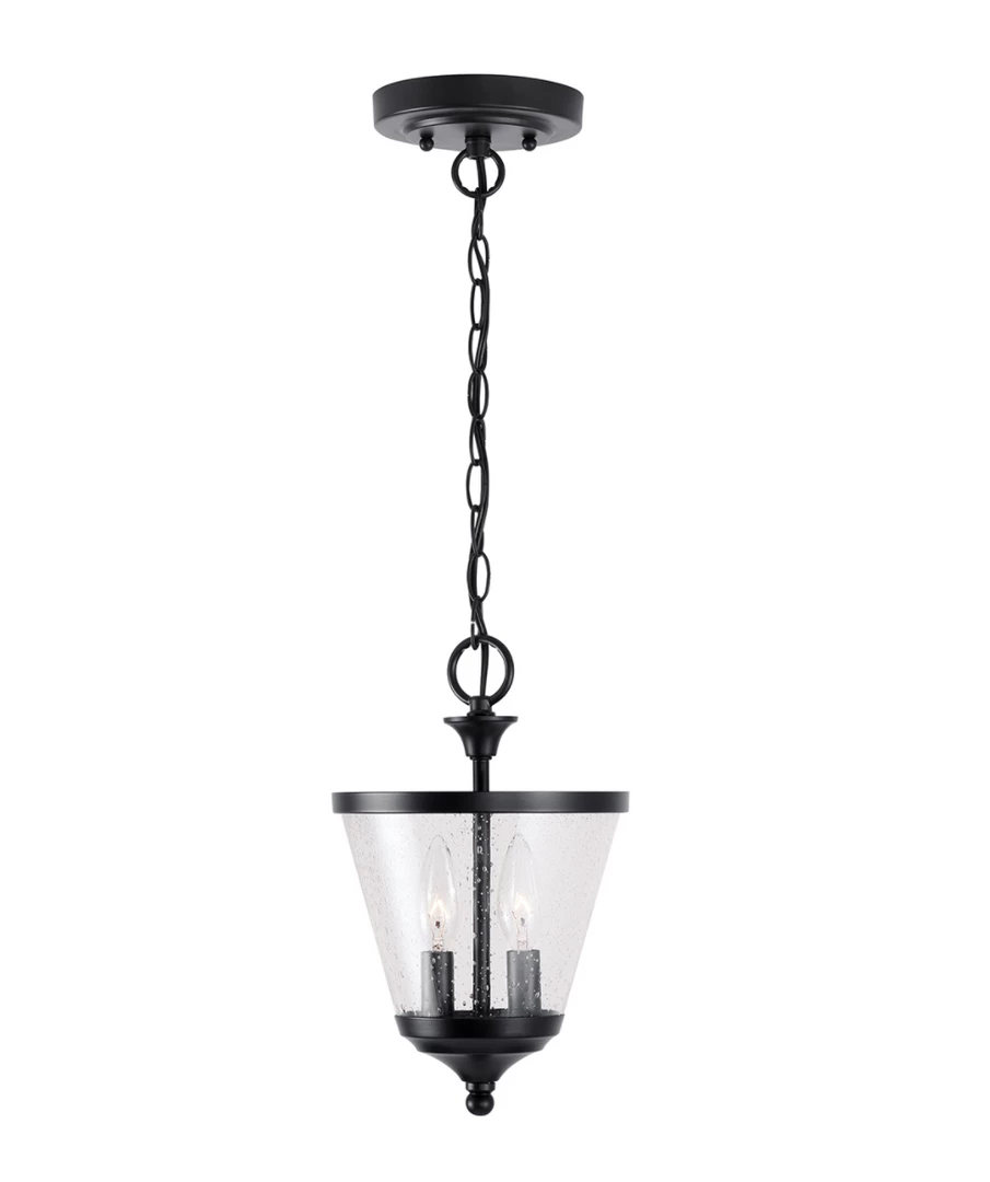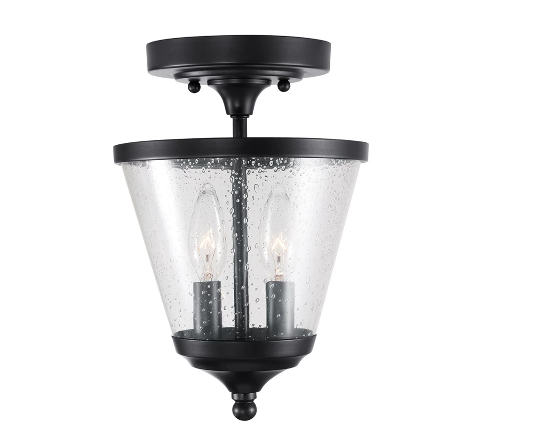 The versatile Stacy light has the option of being semi-flush mounted or suspended from a chain. A round tapering shade crafted of clear, seeded glass lends texture to the glow from its two lamps. Miniature ball accents and a rounded finial complement the seeding.