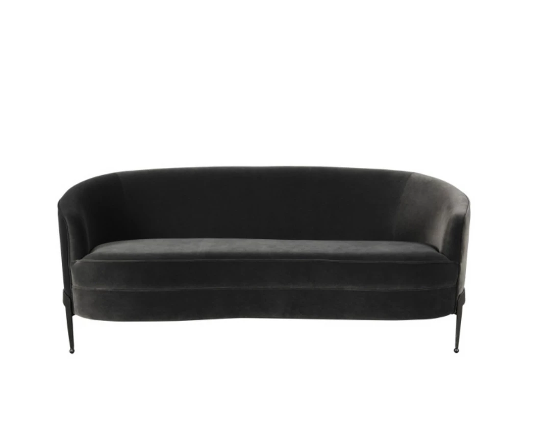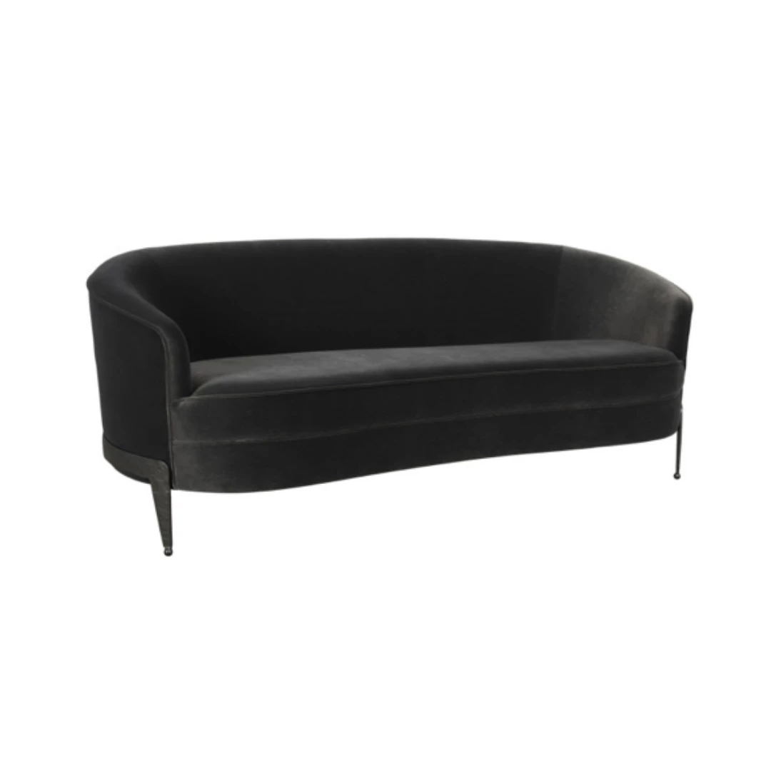 This dark gray sofa features a classic curved back accented by piping and hammered iron legs.