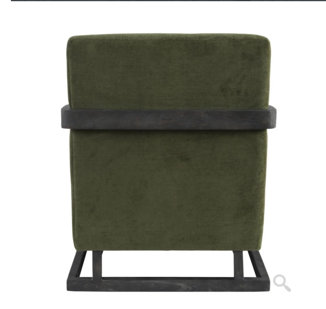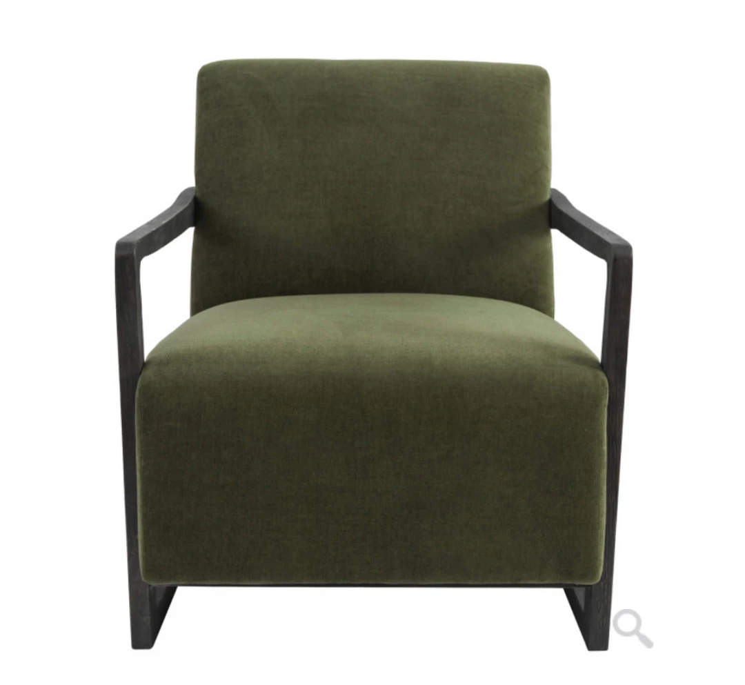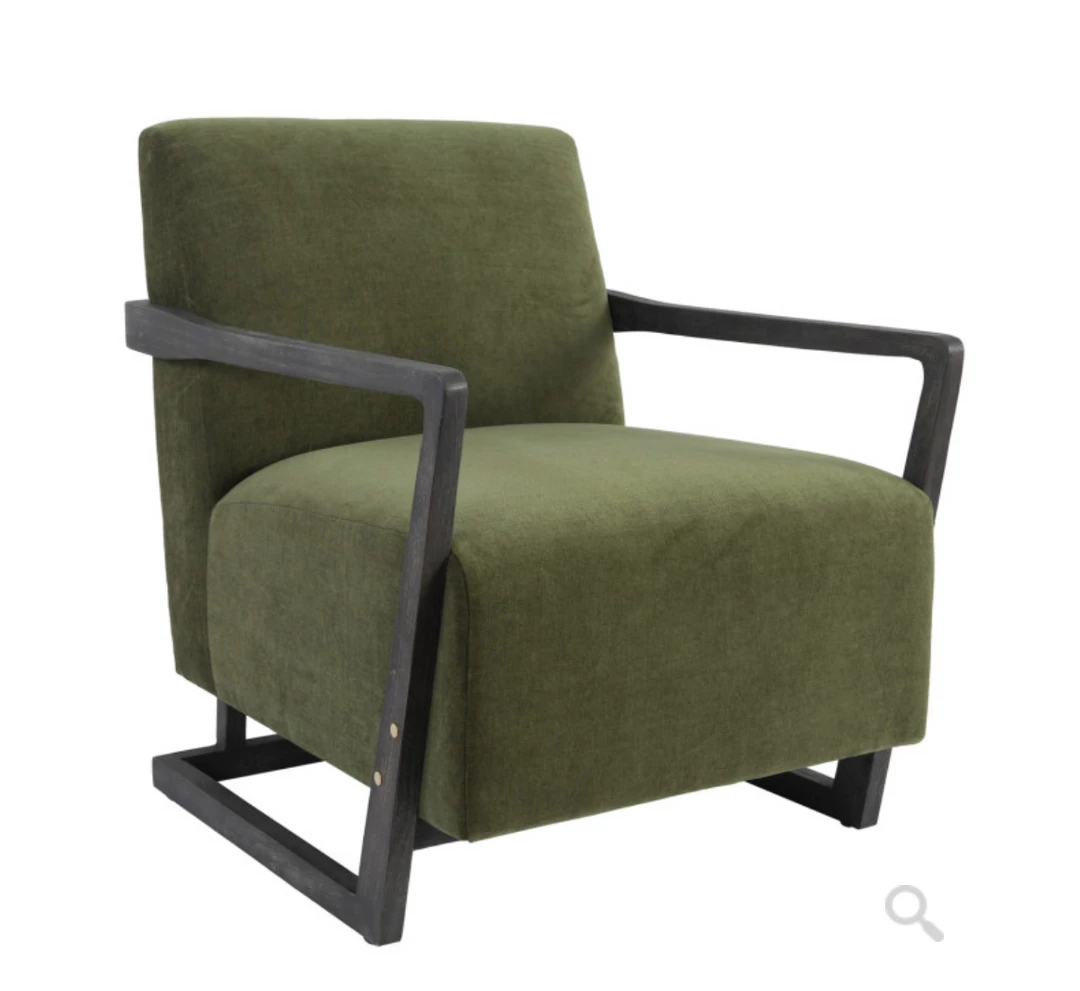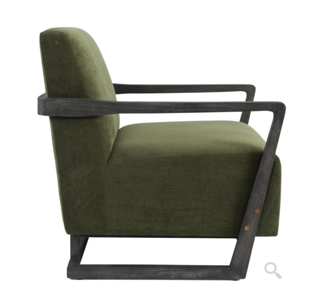 Richly hued upholstery and contemporary design give this accent chair a bold look while metal dowel joints add a touch of gleaming contrast.