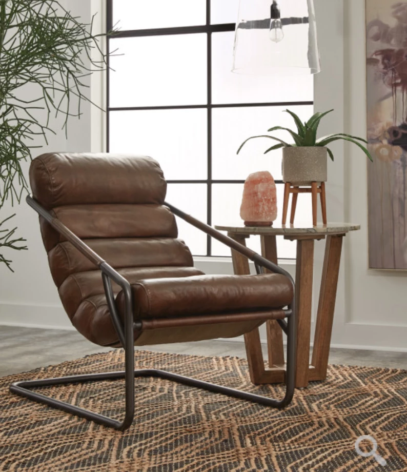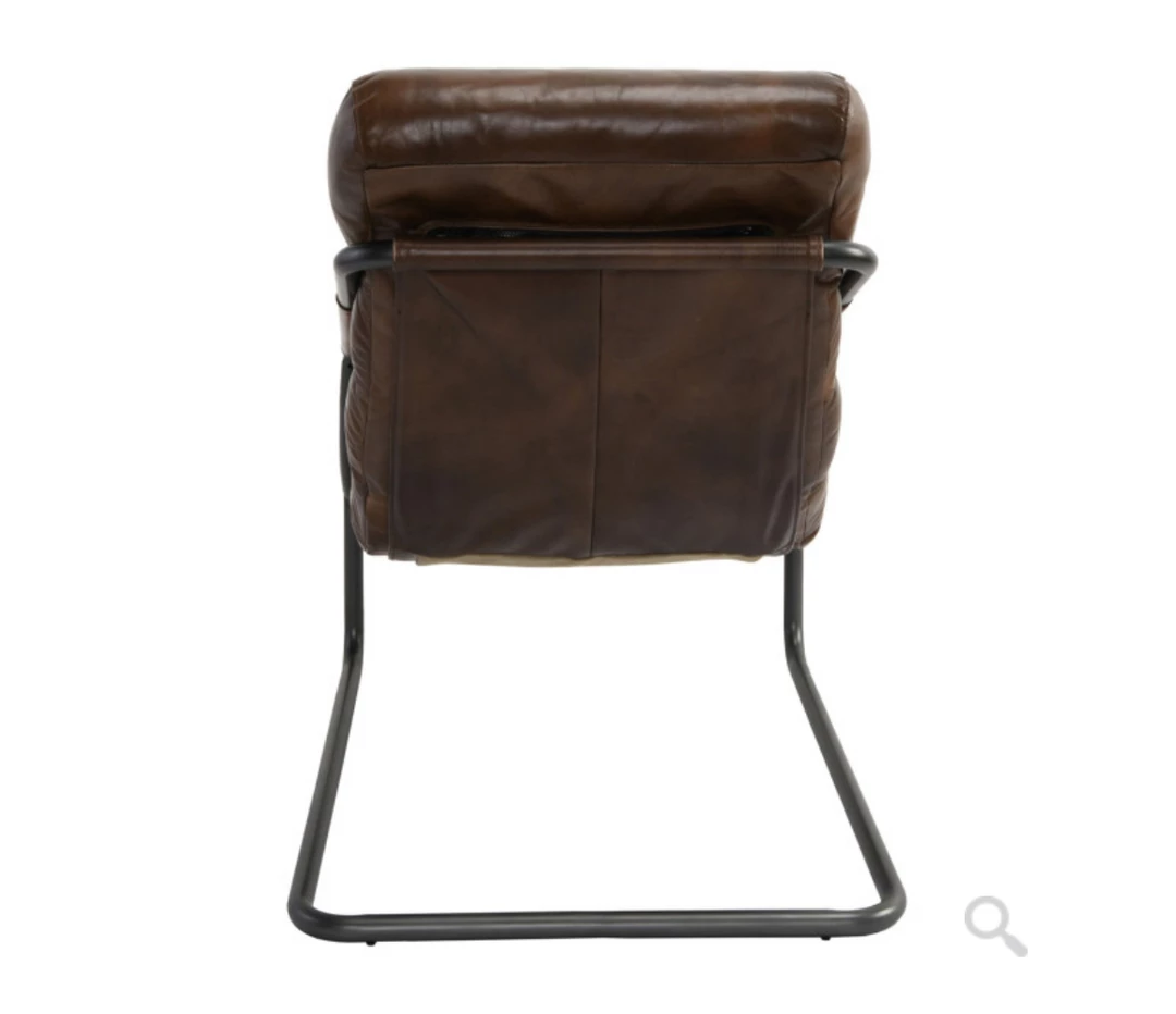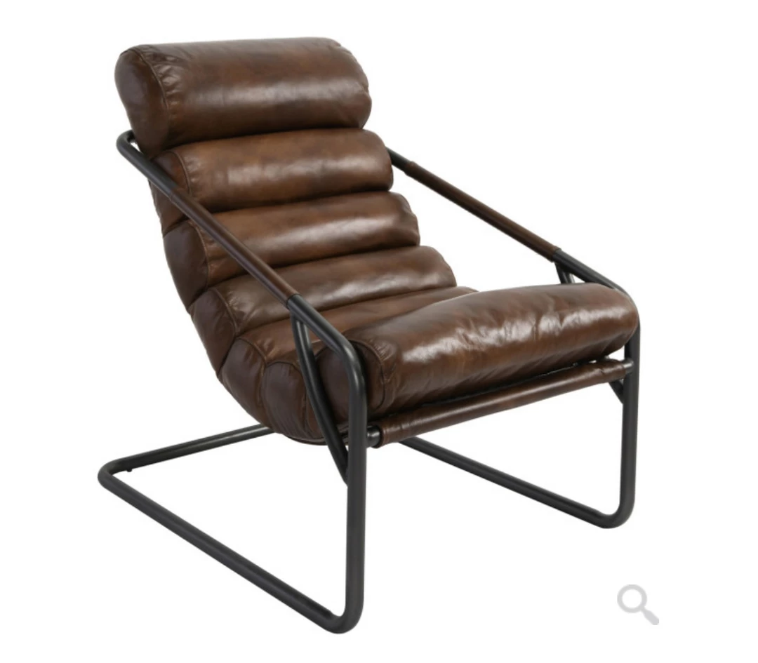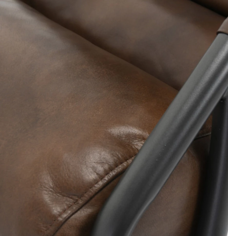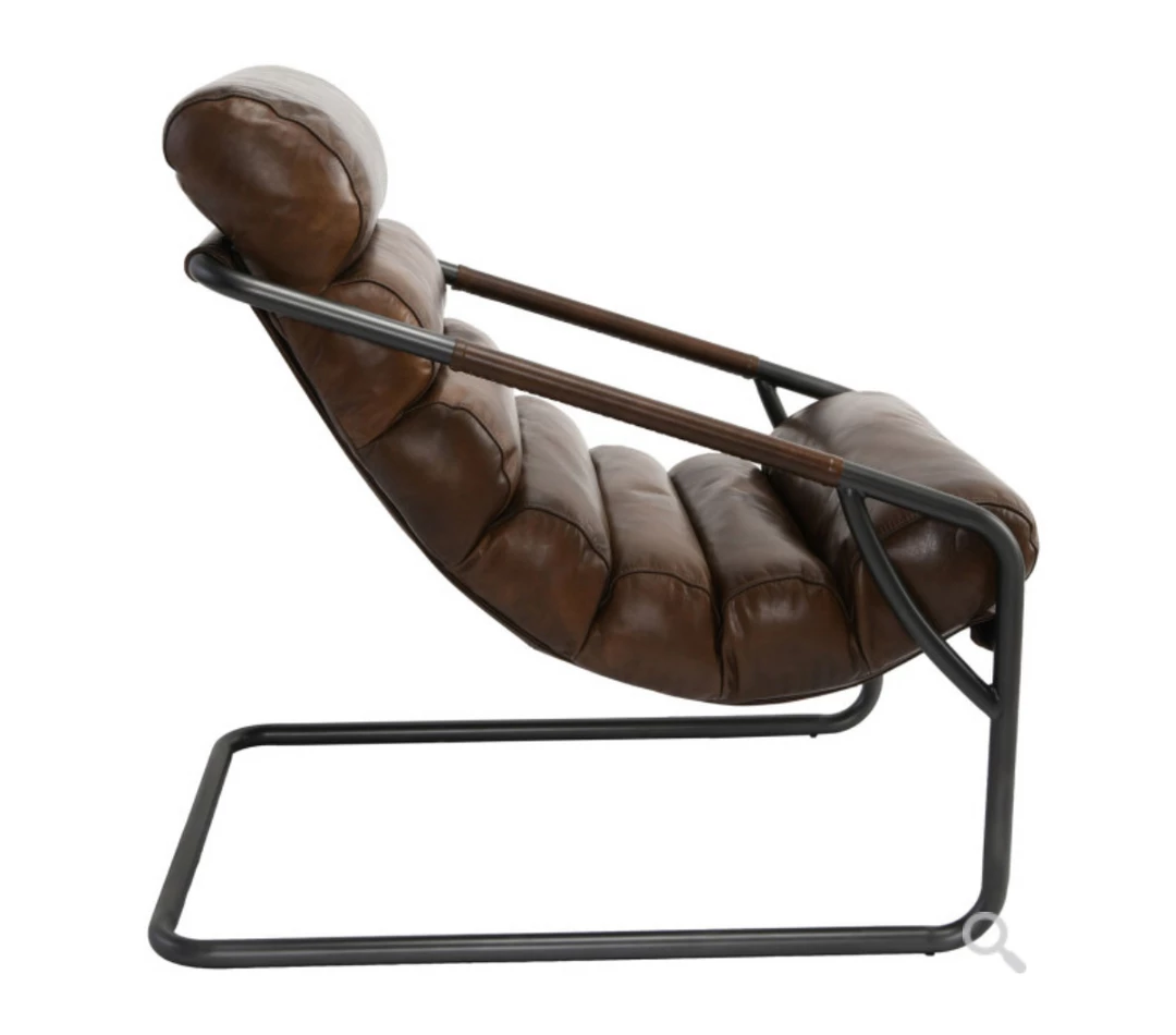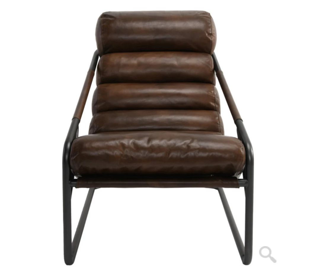 Relish the supple feel and exceptional durability of top grain leather with this chic chair featuring a black iron frame, channel back, and richly dyed leather upholstery.