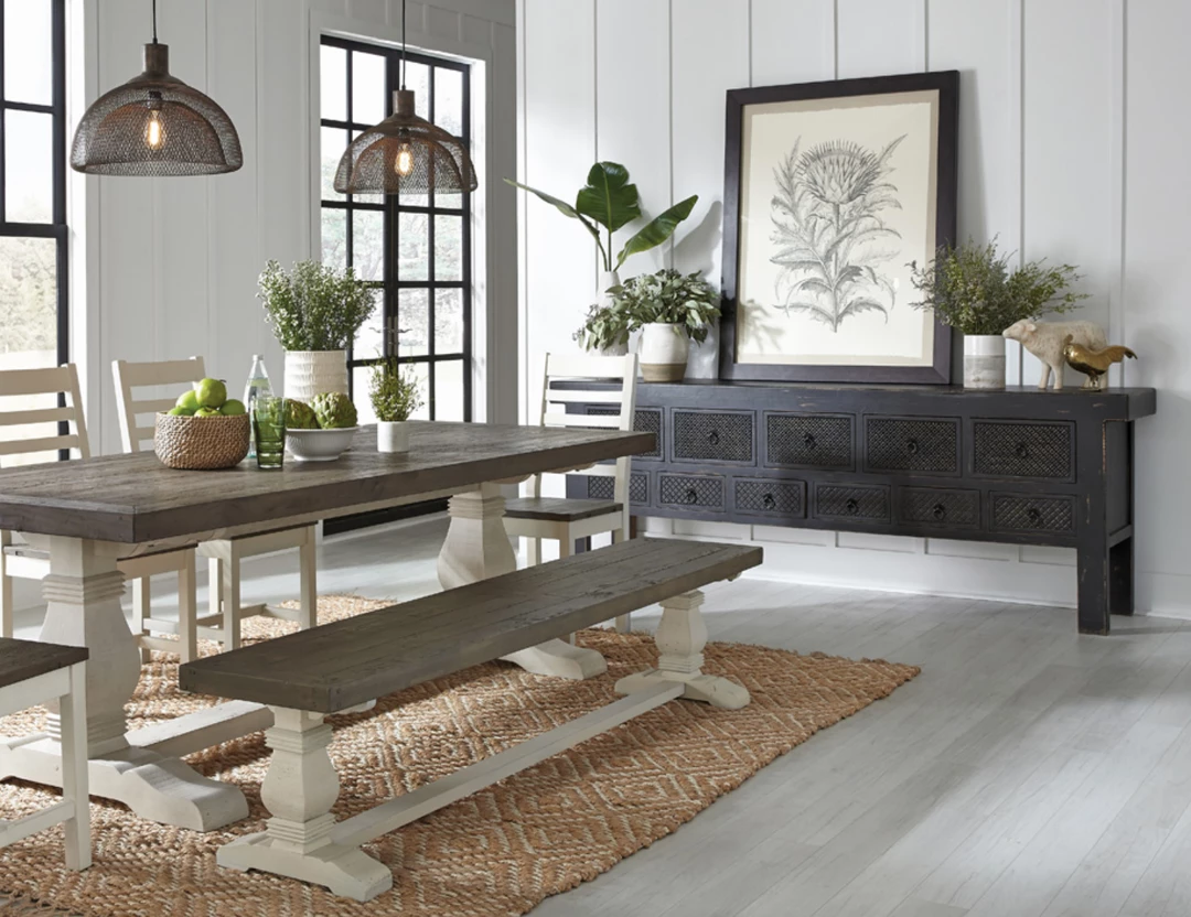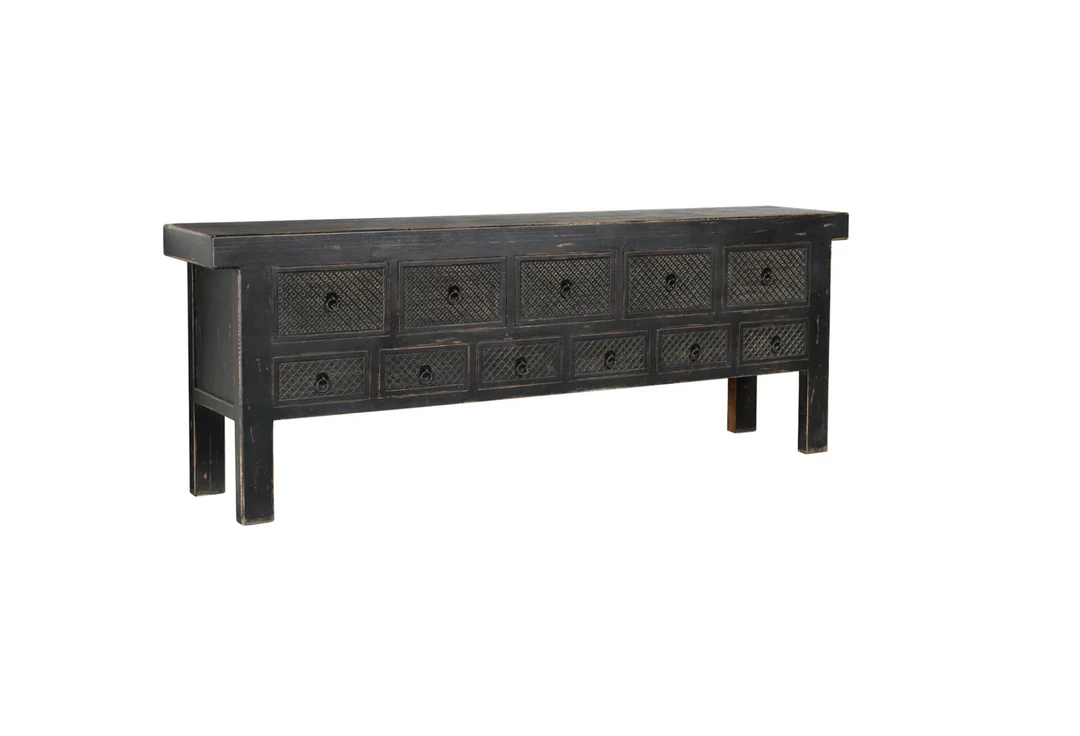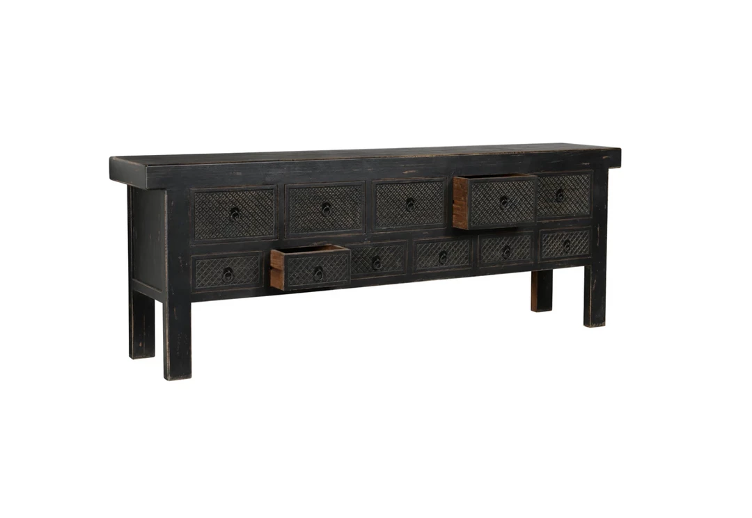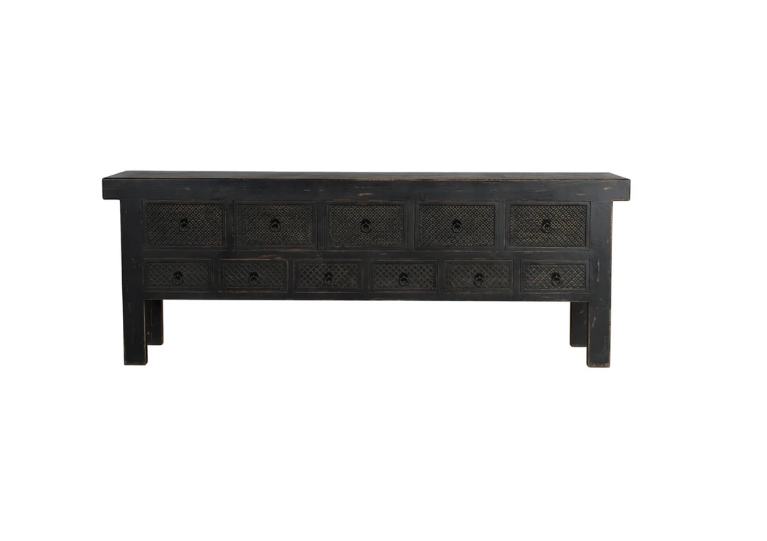 Lahey is made with reclaimed pine wood that has been hand distressed to enhance the beauty of the wood’s natural variations. The sideboard’s black finish is broken up by 11 drawers, each with a hand carved pattern.Â