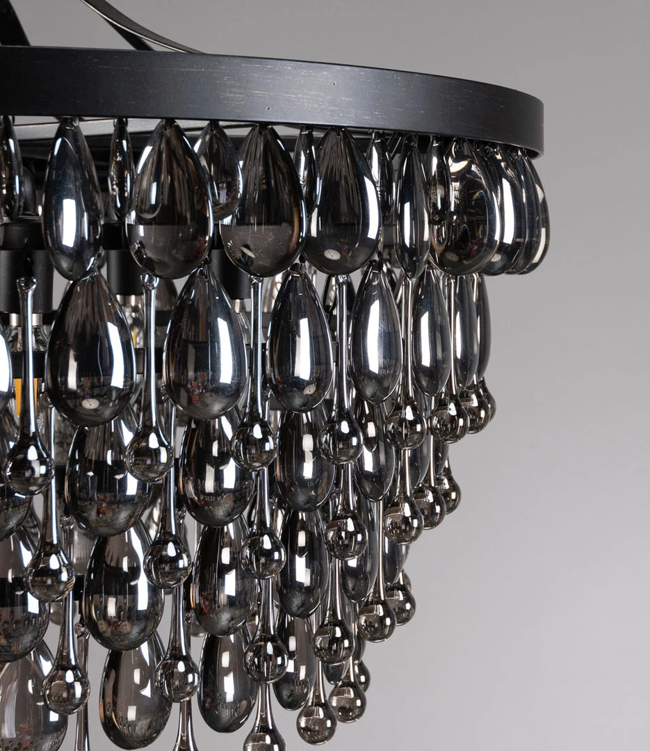 Glass droplets create brilliant shine in this vintage-style chandelier featuring seven bulbs within an iron frame.