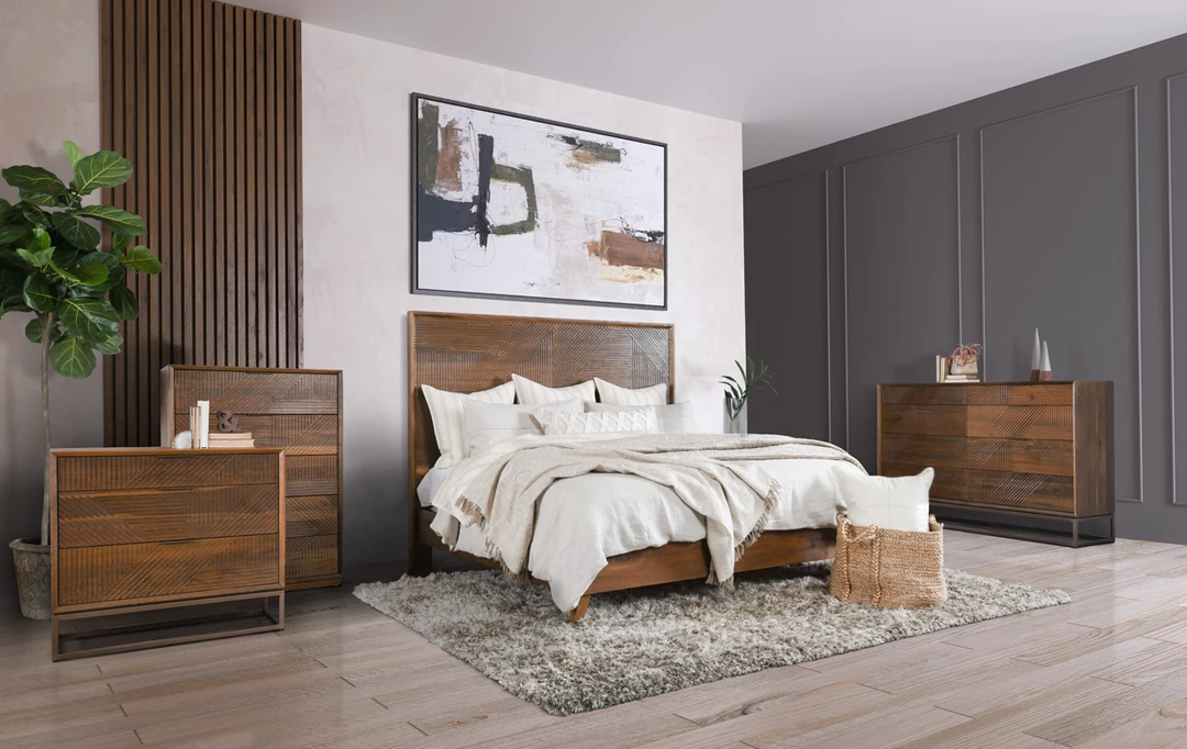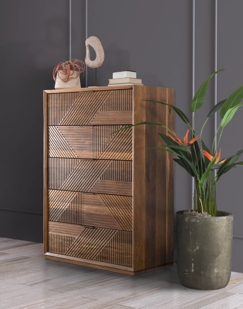 Designed as a modern showpiece, this chest features a sharp, linear pattern carved into its front. Five generously sized drawers keep items organized and tucked neatly away. With its warm wood finish, this piece suits any color scheme.