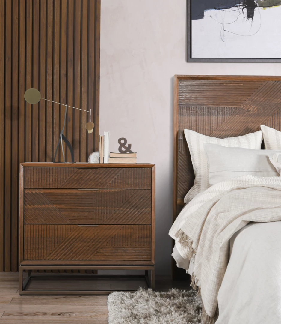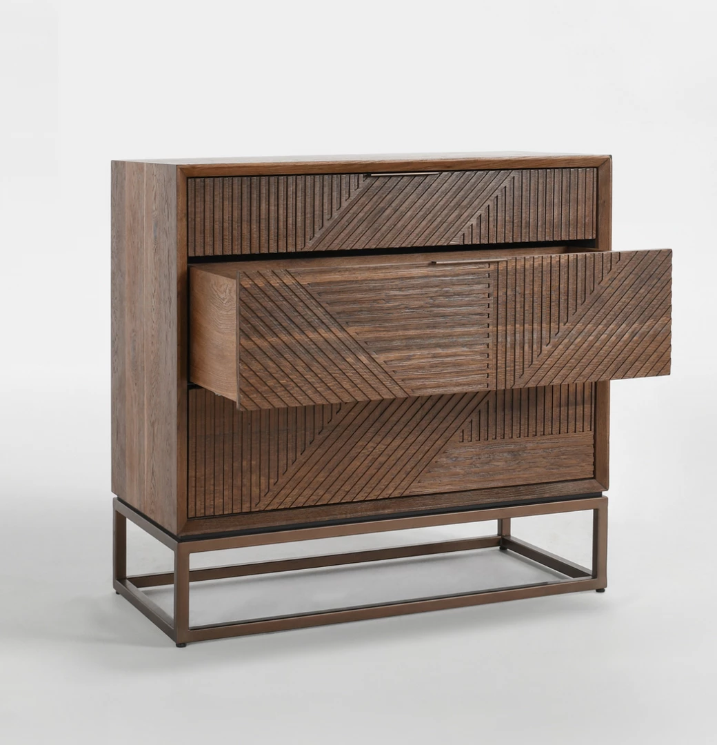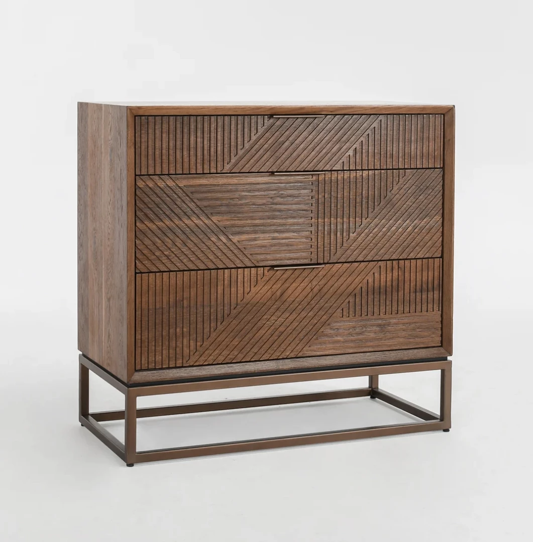 Designed as a modern showpiece, this dresser features a sharp, linear pattern carved into its front and a solid iron base. Three generously sized drawers keep items tucked neatly away. With its warm finishes, this piece suits any color scheme.