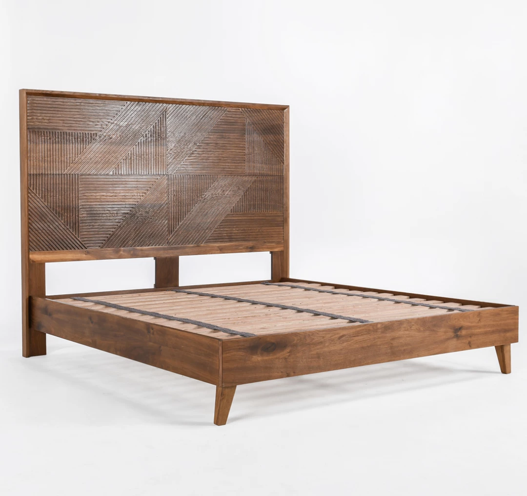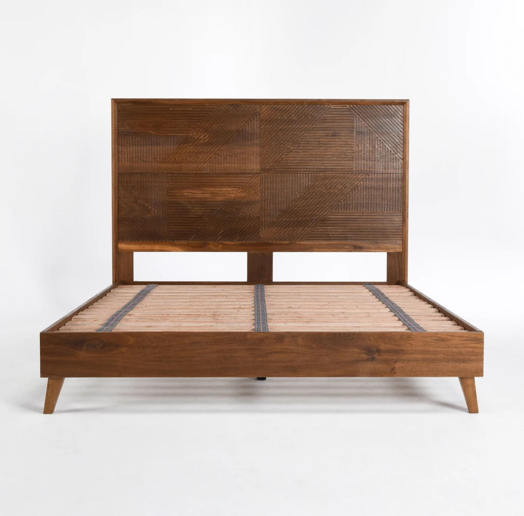 Designed as a modern showpiece, this queen bed features a sharp, linear pattern carved into its headboard. A warm, medium brown finish highlights the natural variations inherent in oak wood. Angular and sophisticated, this piece enhances any space.