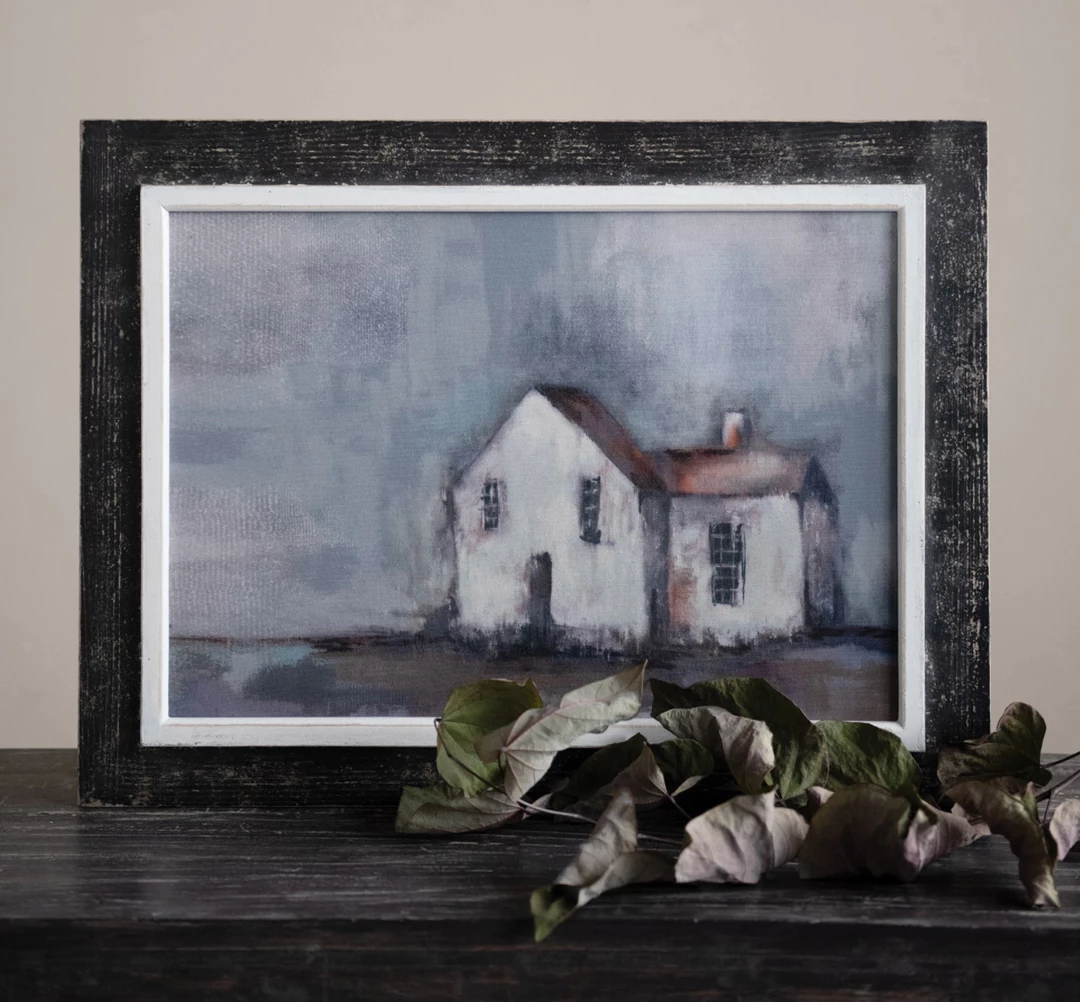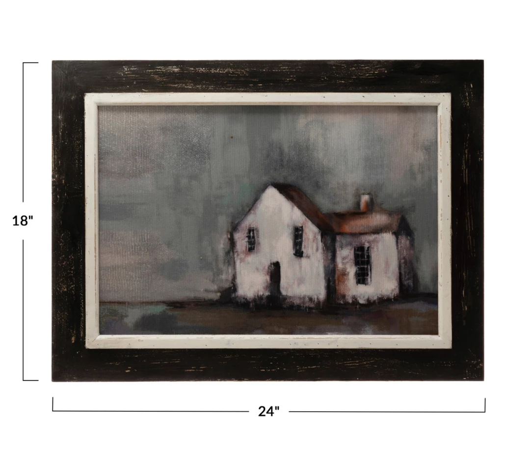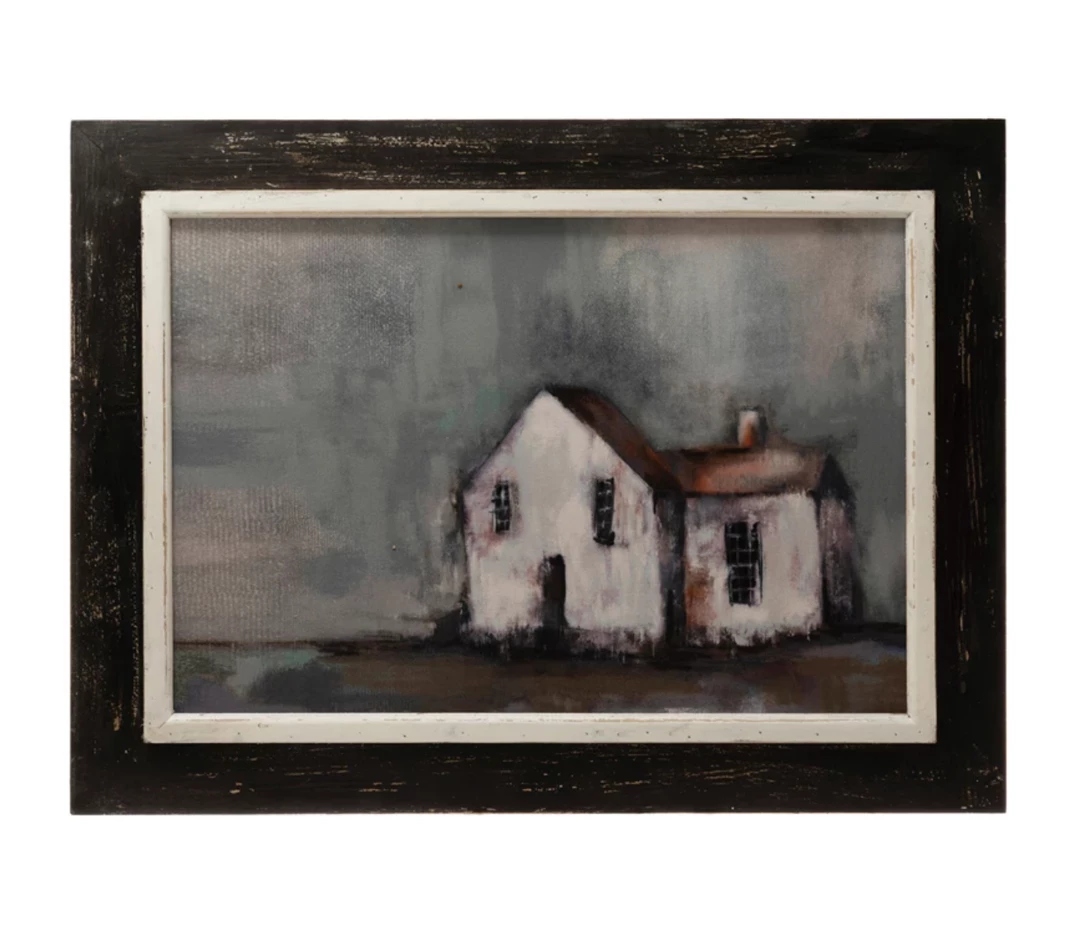 This winsome, charming framed canvas wall decor of a quaint house adds a simple and calming touch to a bedroom, den, dining room, or entryway. Charming on its own, or hanging with a collection of art and favorite photos. Effortlessly works with a wide range of home decor styles.