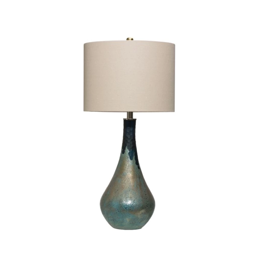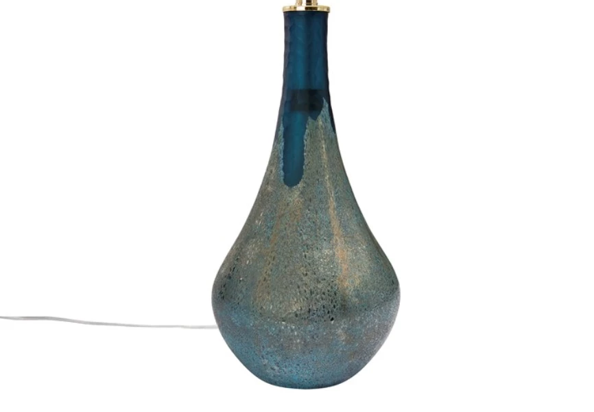 Shades of blue and green mingle with an opal finish creating images in the mind of a tranquil Caribbean ocean. The color and texture of the embossed neck, melt into the body of the lamp creating a piece that is unmatched. This lamp will add luxurious elegance to any room decor.
