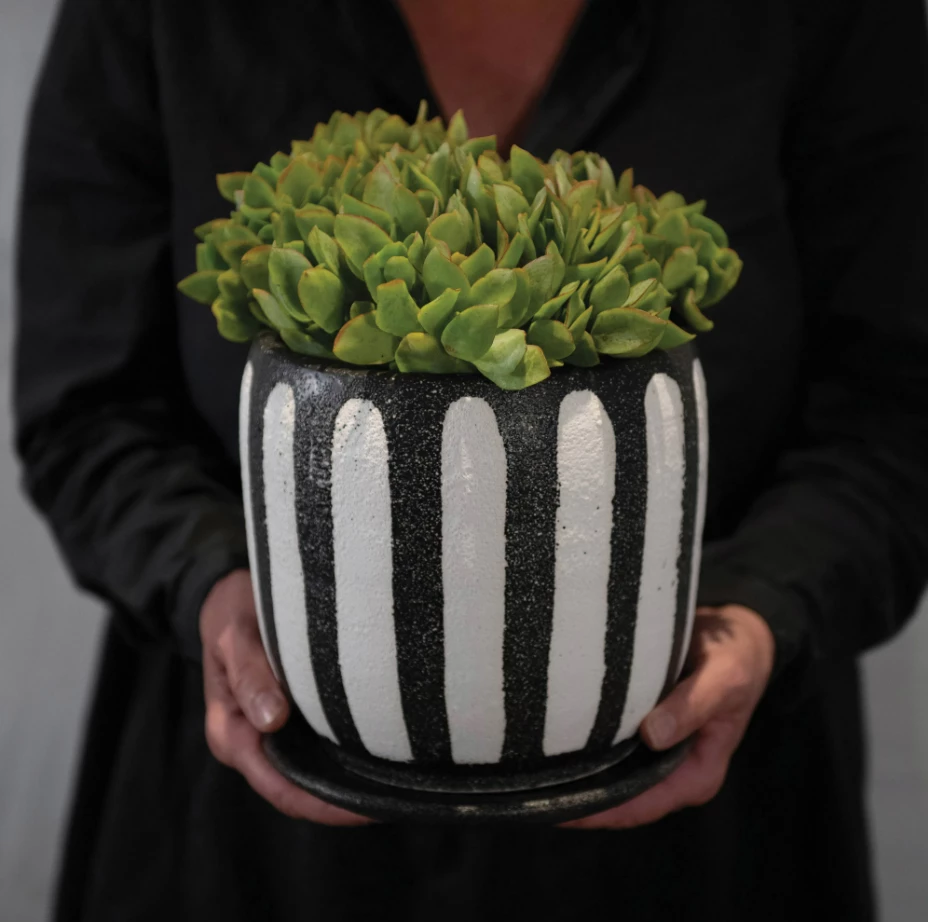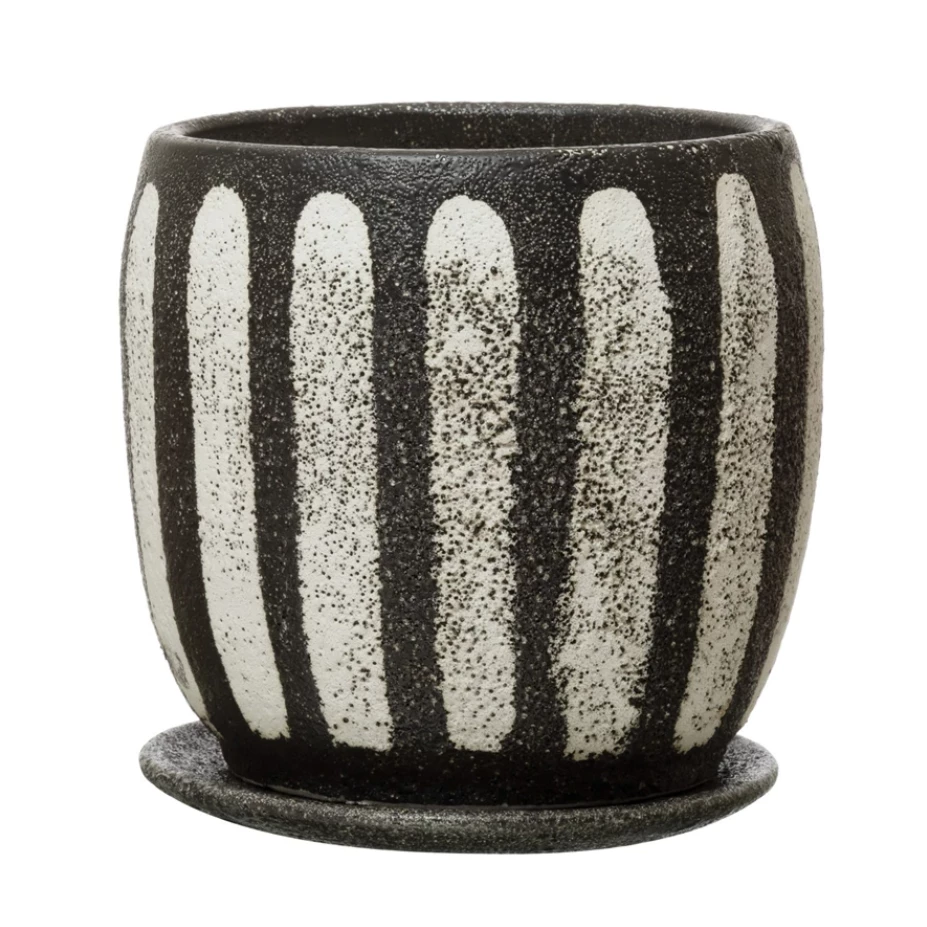 This brilliant, bold hand-painted terra-cotta planter with saucer comes as a set of two. Delightful stonework and a unique design make this container an eye-catching piece for any room of your home or business. Display a pair for a grand and whimsical style.