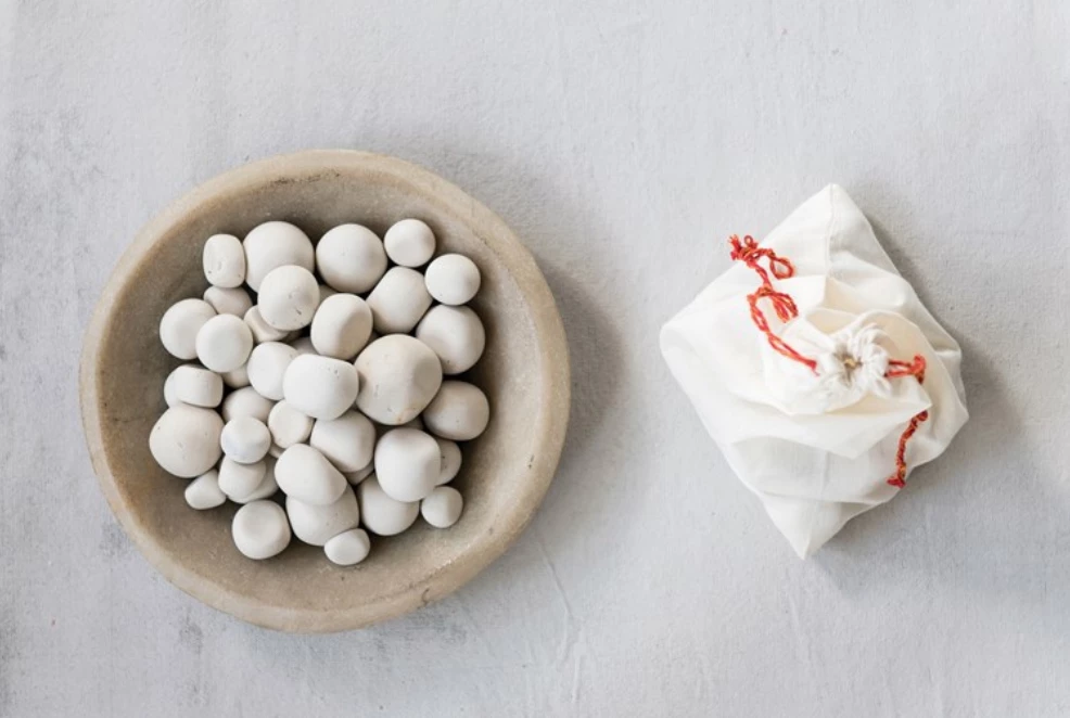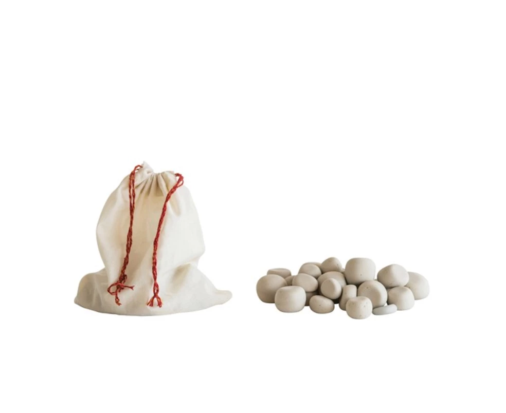 1″ Stone Pebbles in Cotton Muslin Bag, Natural, Set of 24. Perfect as a vase filler.