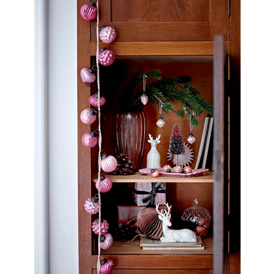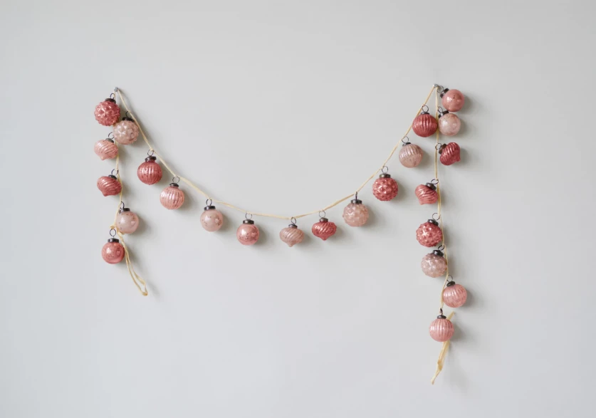 Enjoy the various designs of these glass ornaments. They are attached to a fabric string and create an antique garland to be envied by all. Lay it on a surface around larger items, add to a decorative piece filled with other items, hang on a fireplace mantel or in front of a window.