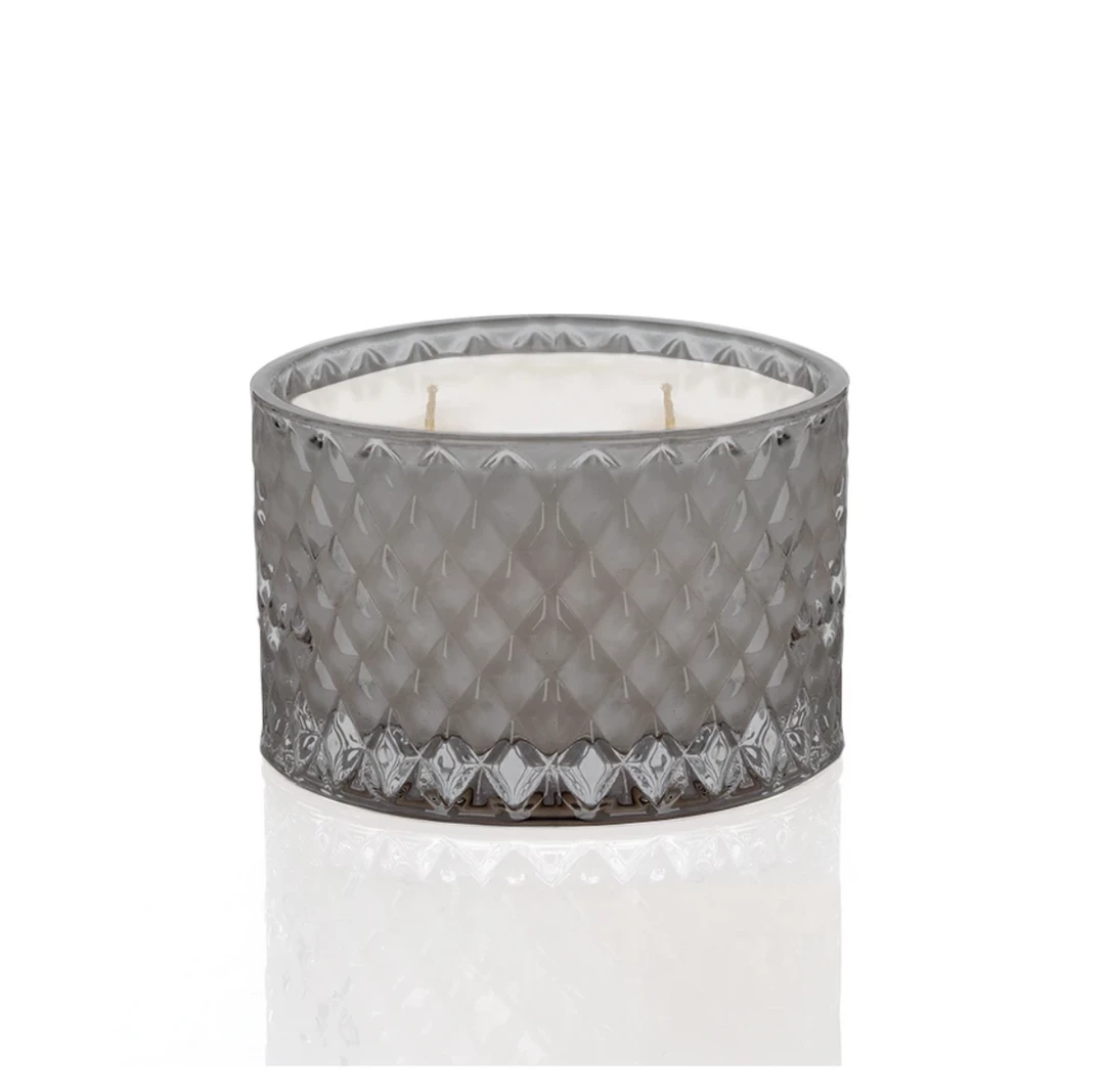 Hand poured, 10 oz soy blend candle in a beautiful large facetted gray glass vessel with a branded wood cover.