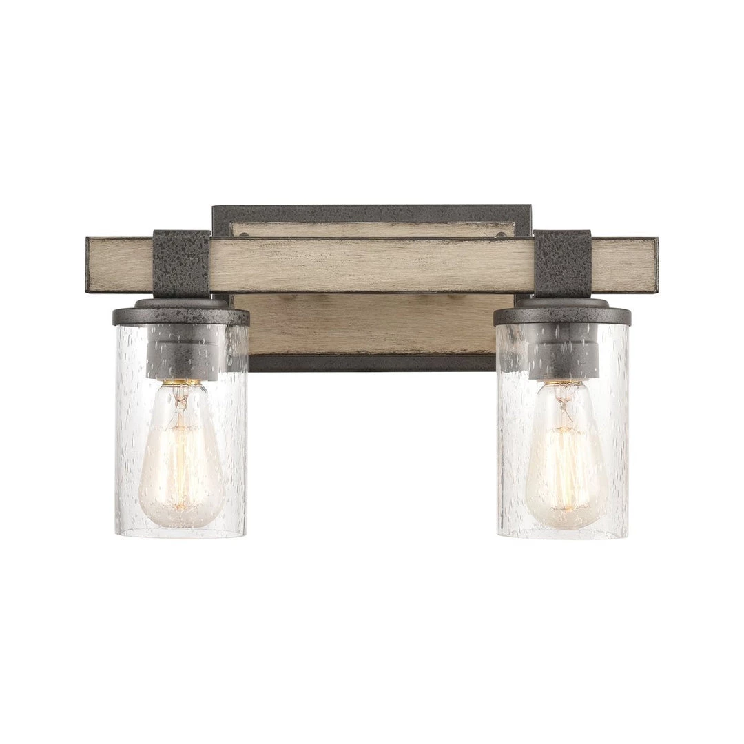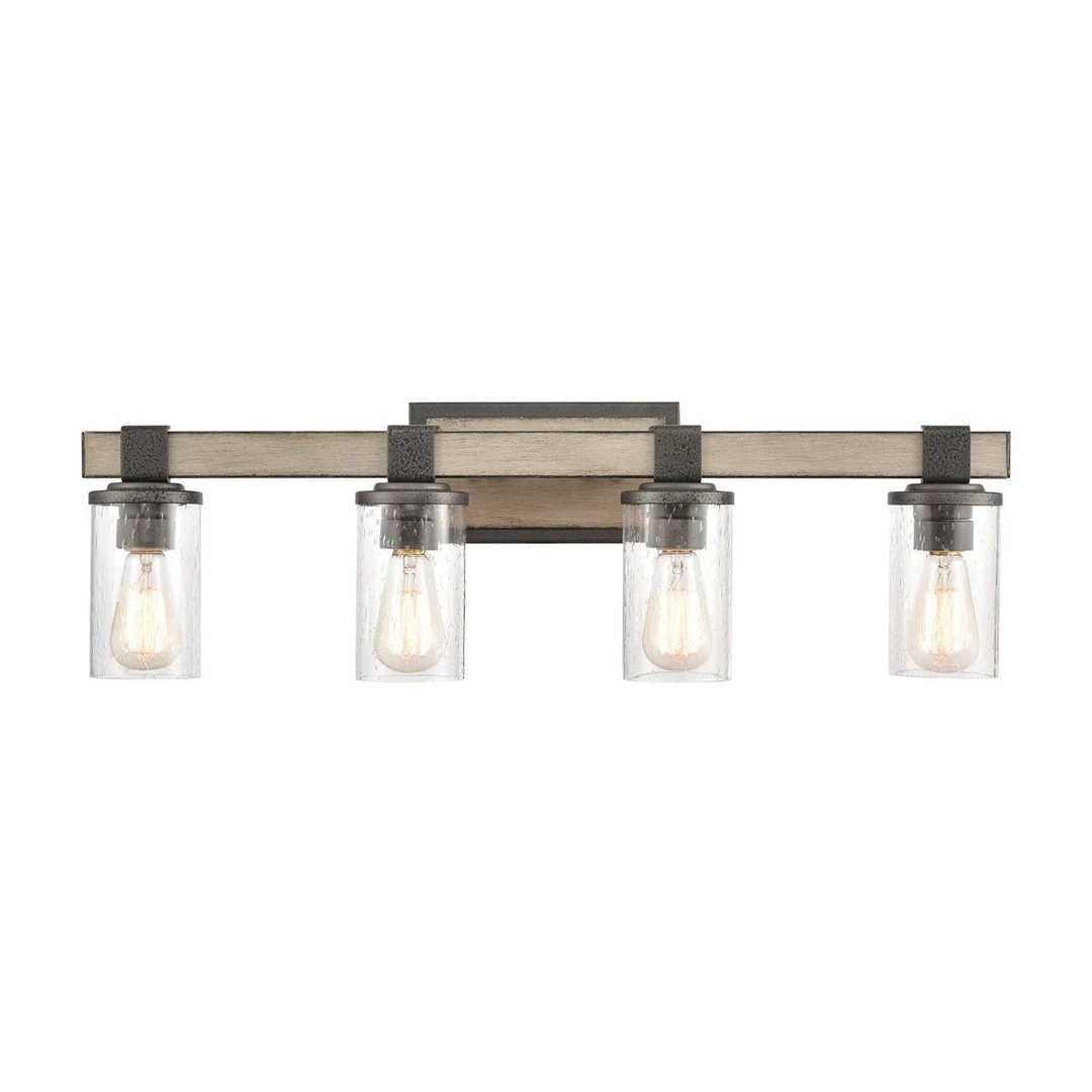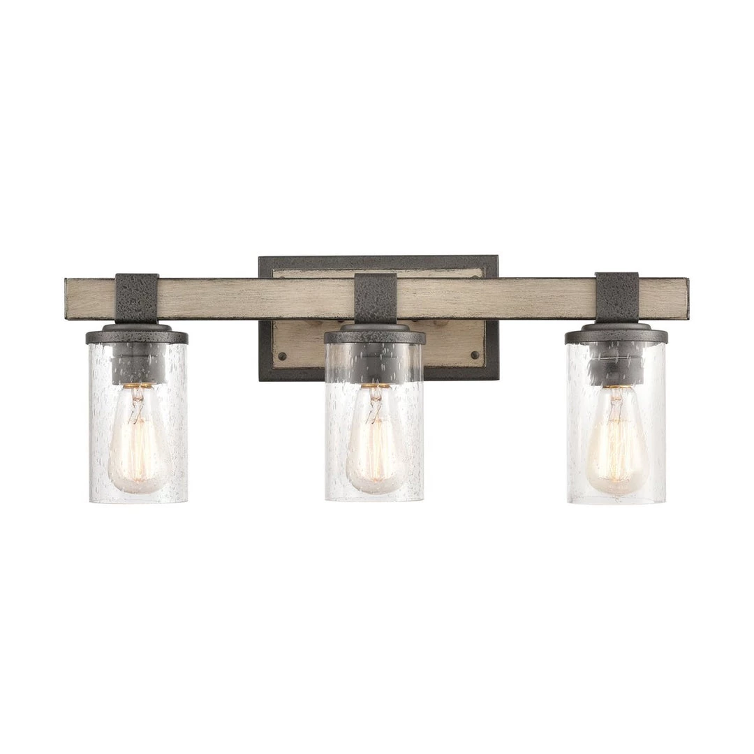 This rustic farmhouse vanity light is constructed of anvil iron and distressed antique graywood.