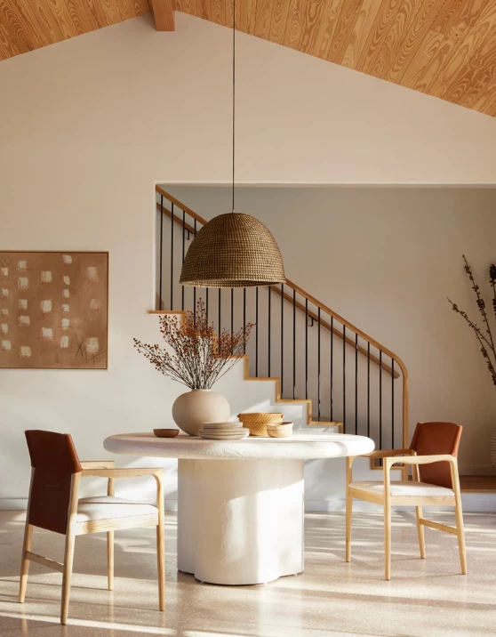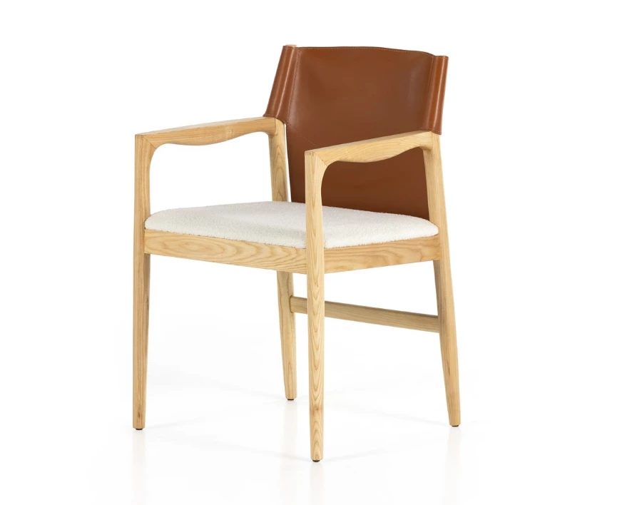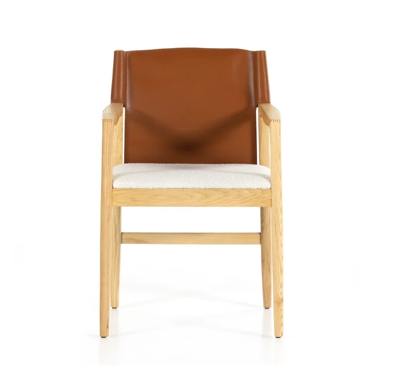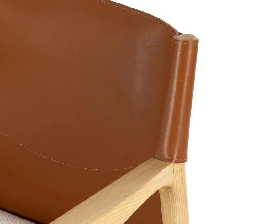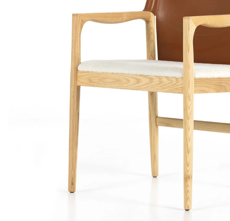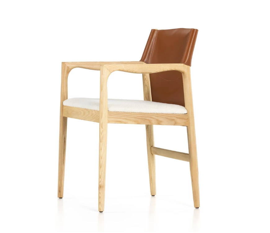 Sleek, streamlined seating with a midcentury vibe. Dining chair features a sling leather seatback and a faux shearling seat in liquid-repellent performance fabric. Subtly curved arms, frame and legs made of solid ash wood.