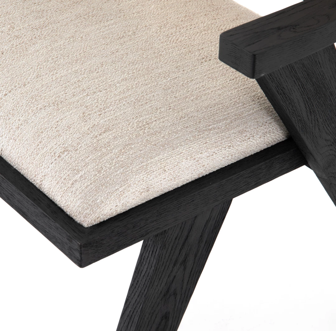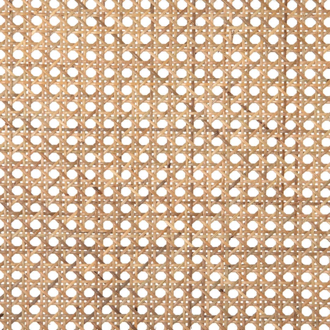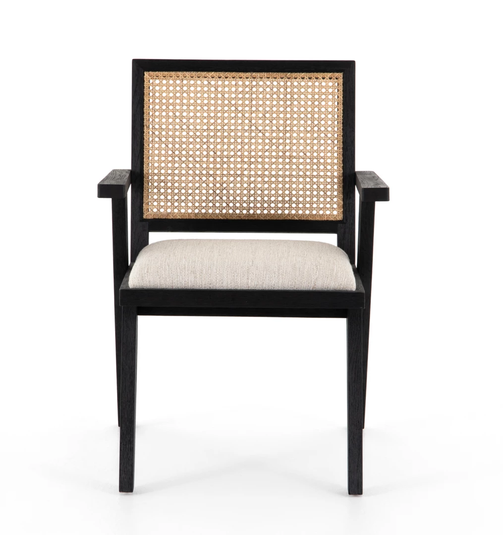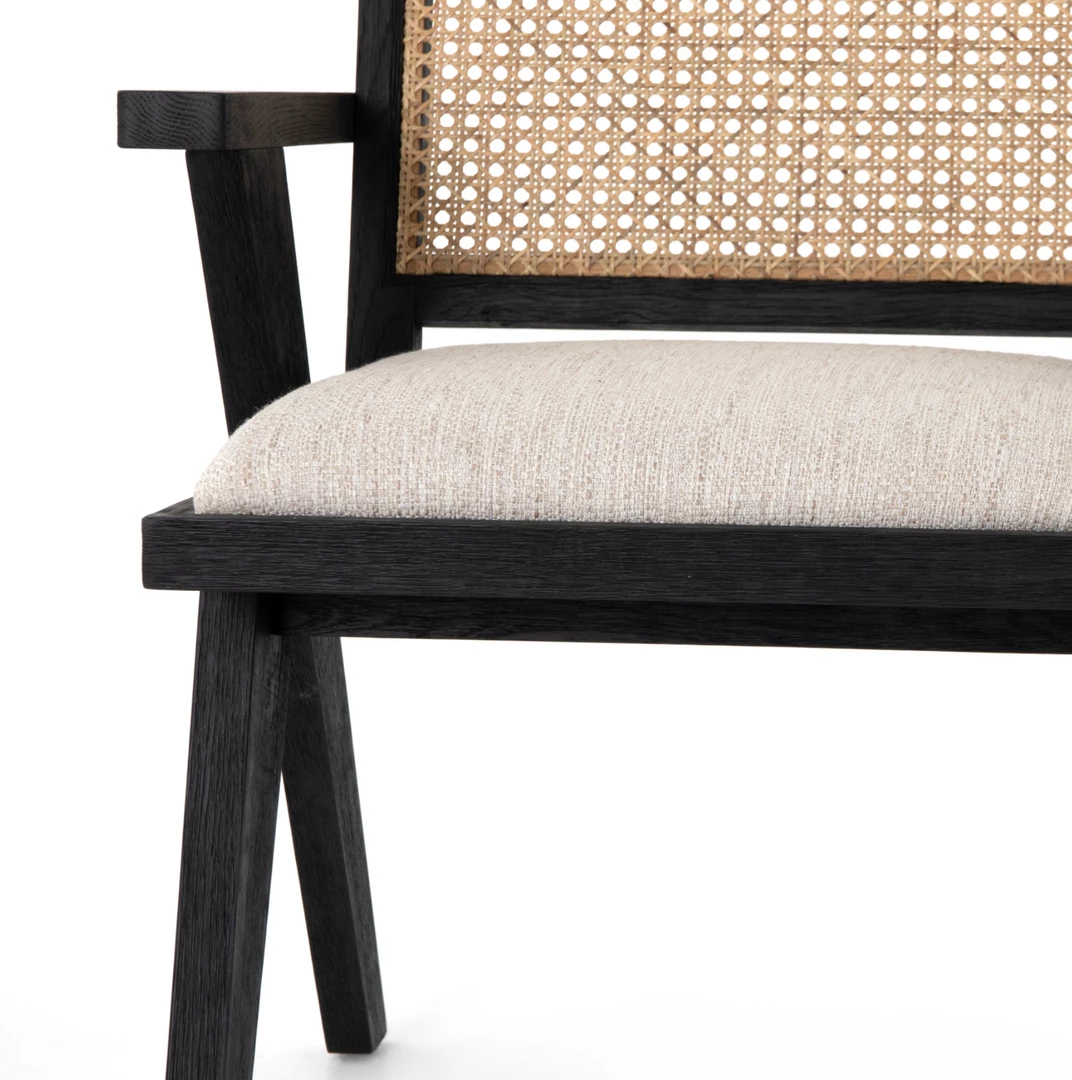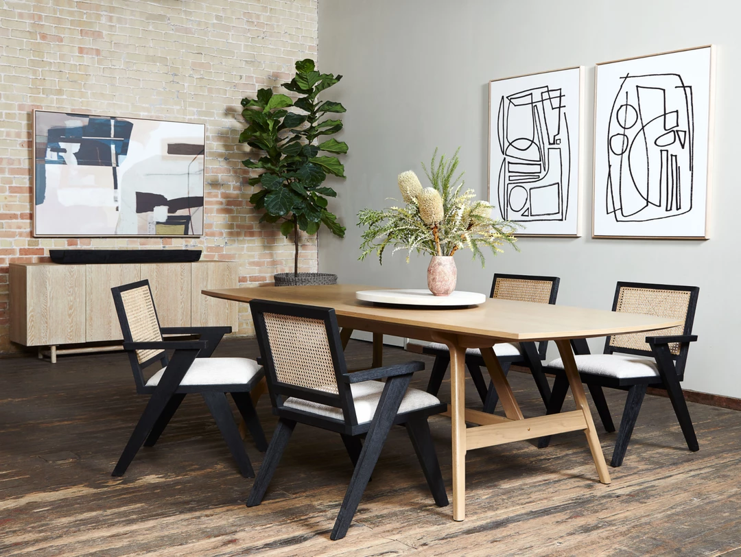 Inspired by Swiss-French architects Le Corbusier and Pierre Jeanneret, a high-contrast dining chair features black-finished solid oak framing, with woven cane seating, for a texture-driven look with mid-century vibes.