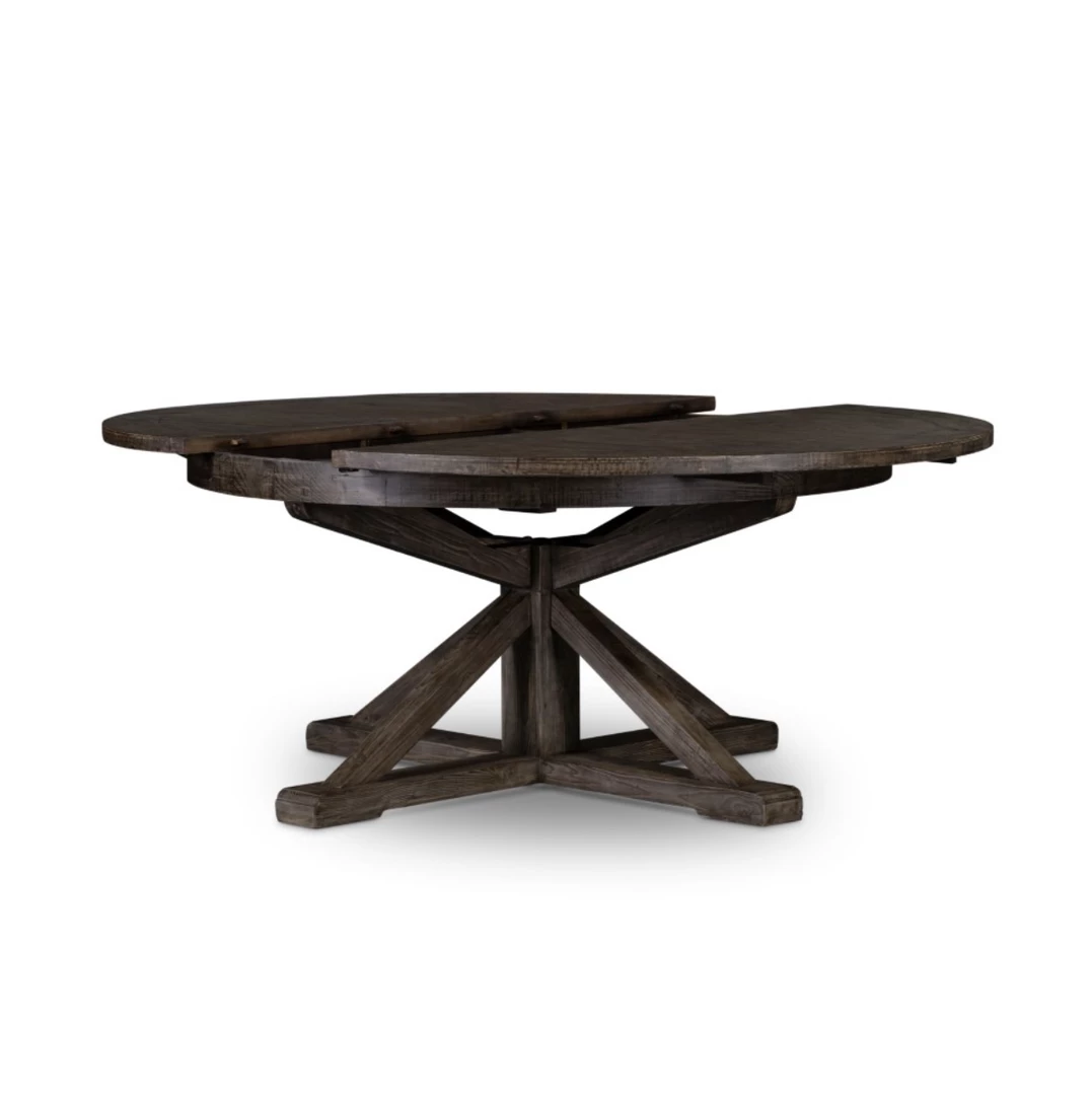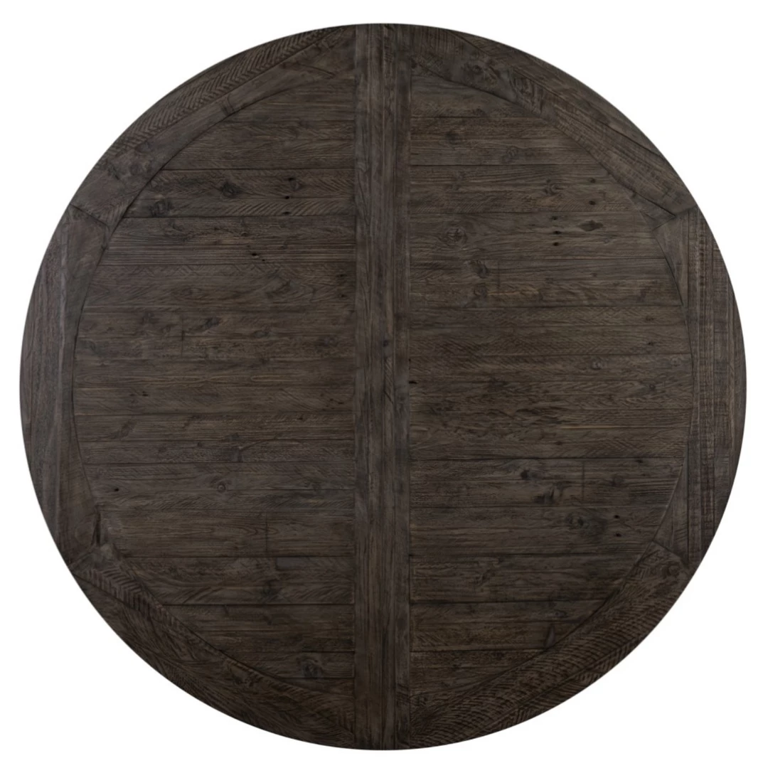 A welcoming, round farmhouse table draws the eye with its reclaimed wood top and a compelling architectural base in a rustic black olive finish. Easily extends to 63″ with built-in leaf.