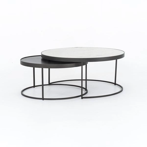 Stacked and structured, slim iron lends edge to the sophistication of polished white marble. Nesting feature for compact functionality and modern, adaptable appeal. Large table measures 36″W x 36″D x 16″H. Small table measures 28″W x 28″D x “14”H. Each one variesÂ