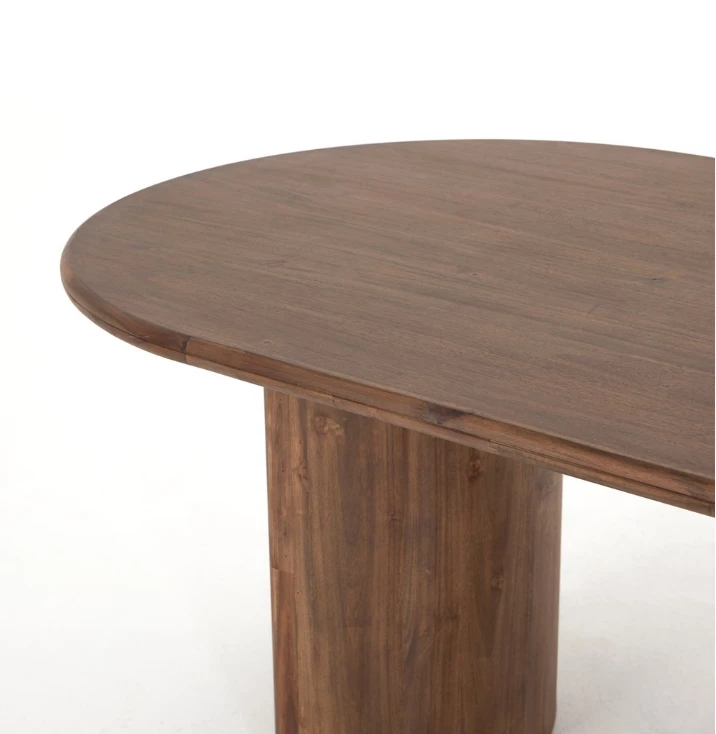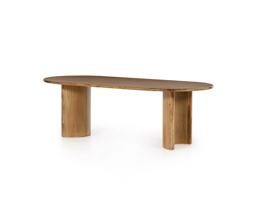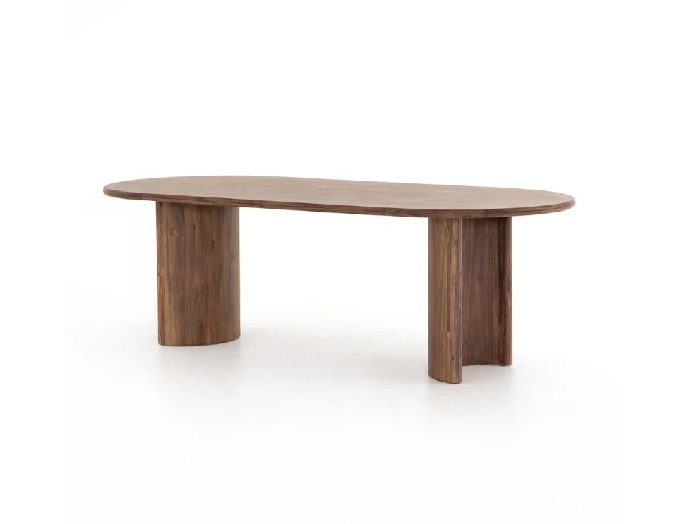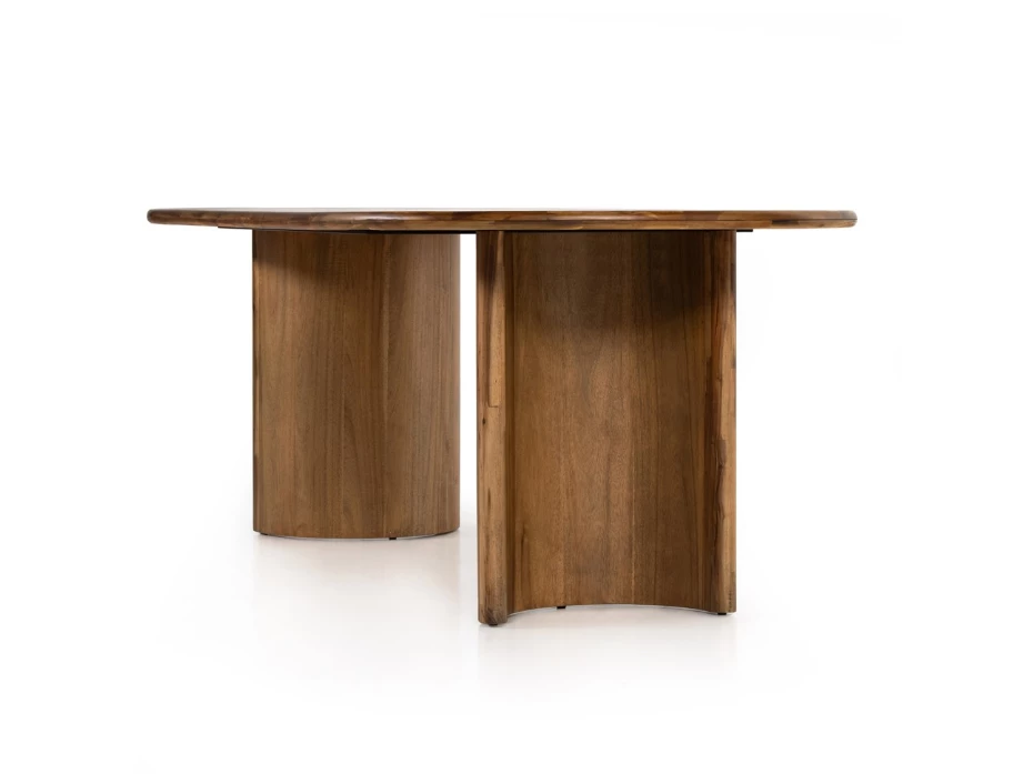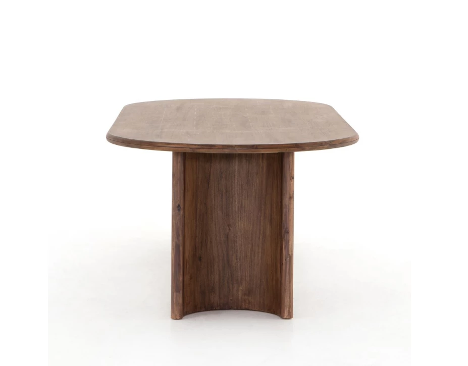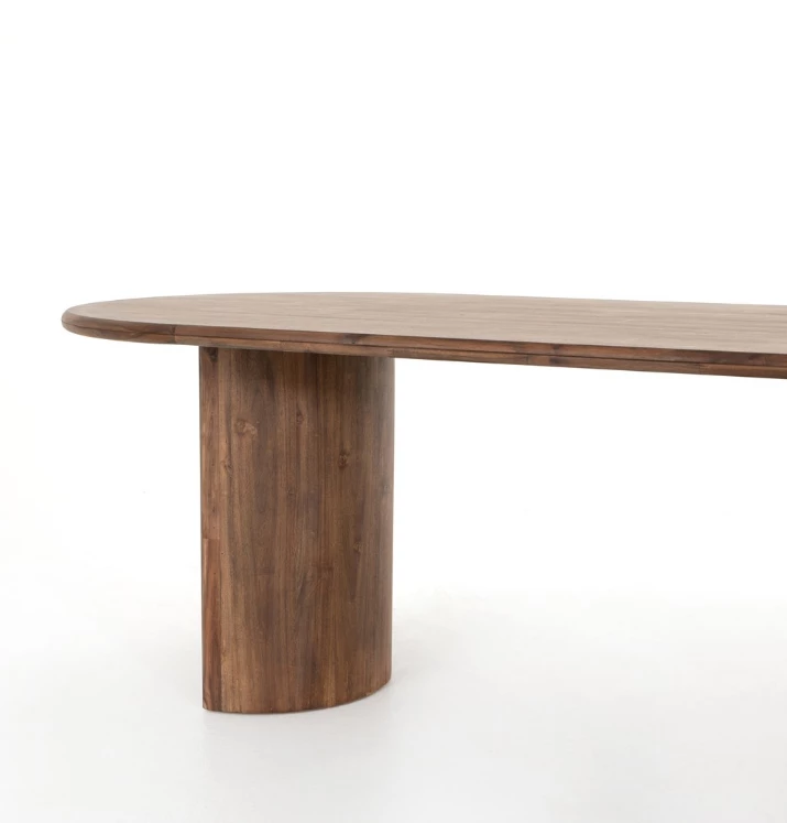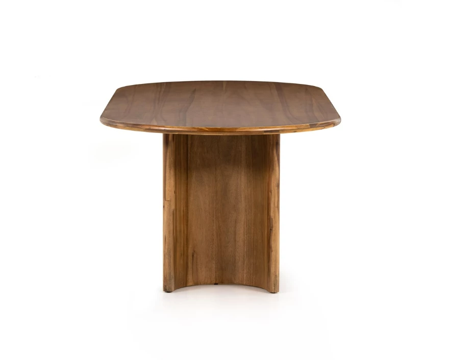 A study in shape. Solid brown acacia forms crescent-shaped legs and sprawling oval tabletop, bringing organic presence to the dining room.