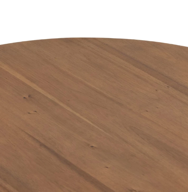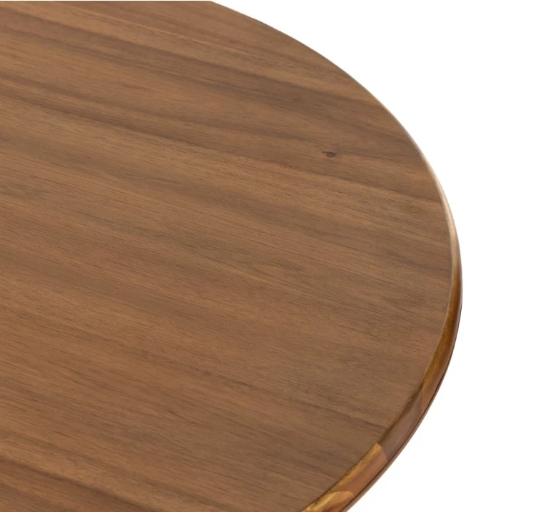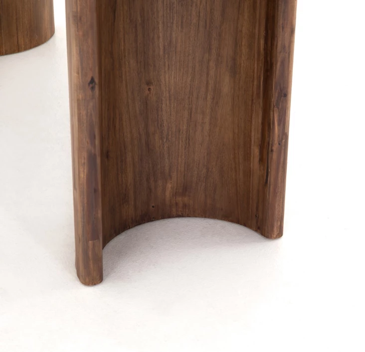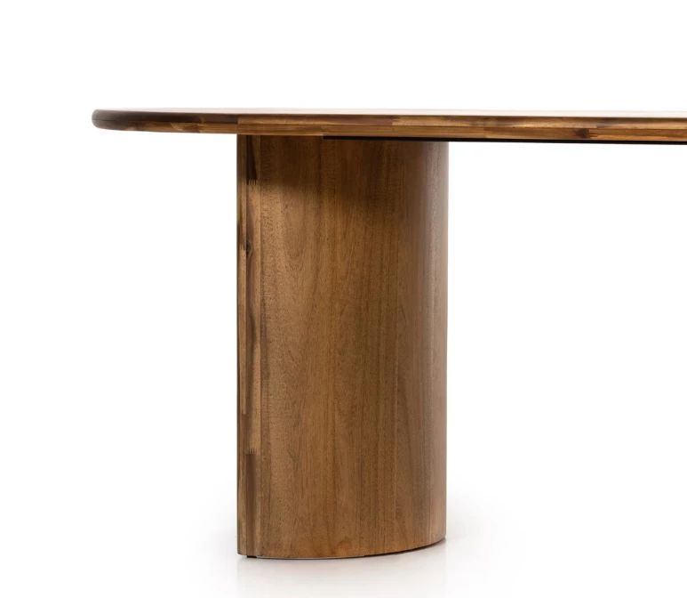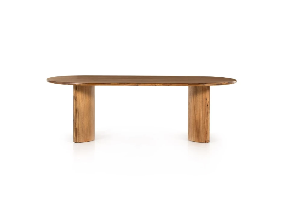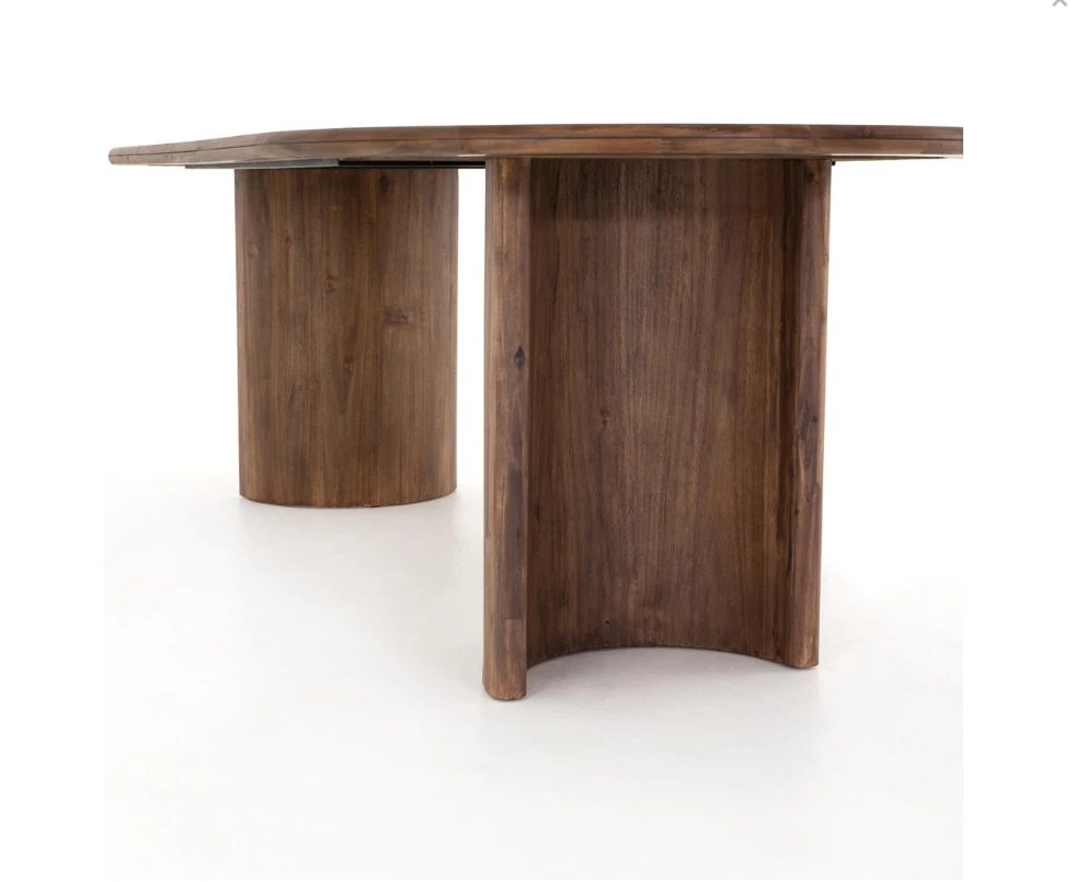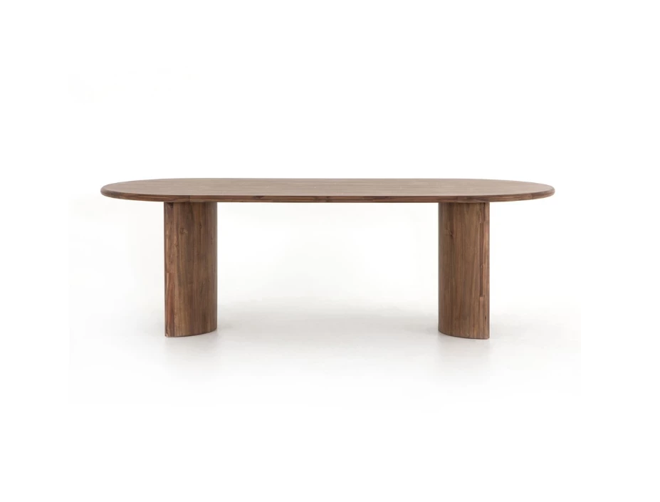 A study in shape. Solid brown acacia forms crescent-shaped legs and sprawling oval tabletop, bringing organic presence to the dining room.