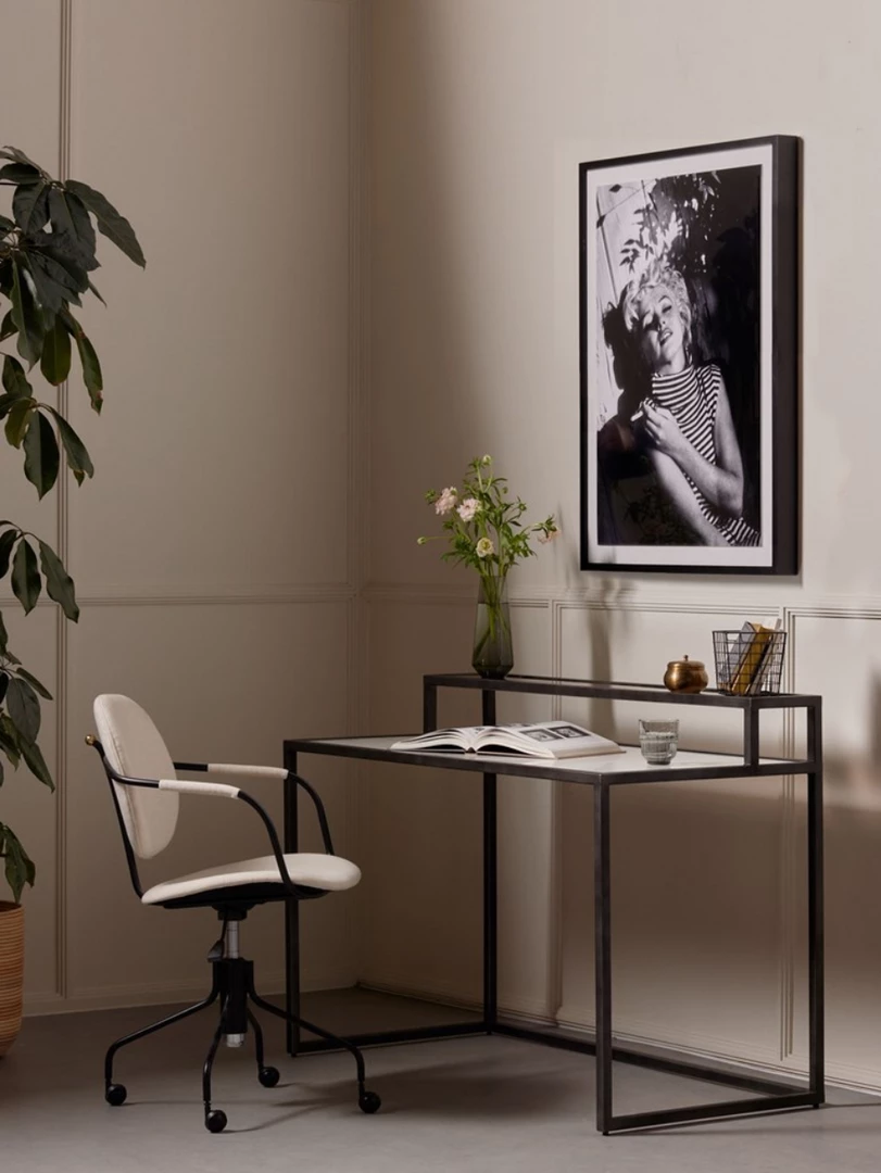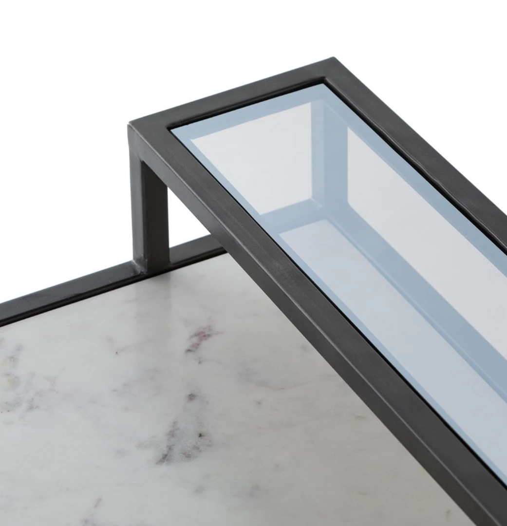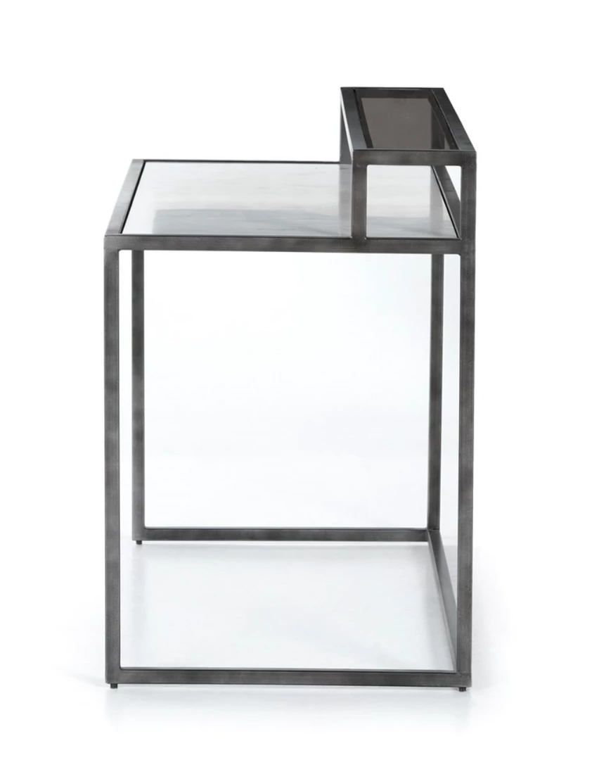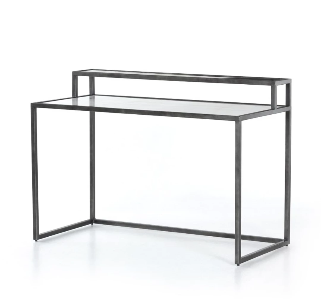 Step up office style. Finished in a hammered grey with a clear powder coat, airy iron frames tiered shelving of polished white marble and smoky grey glass, for a light, feminine look. Pairs well with the Lauren Desk Chair.