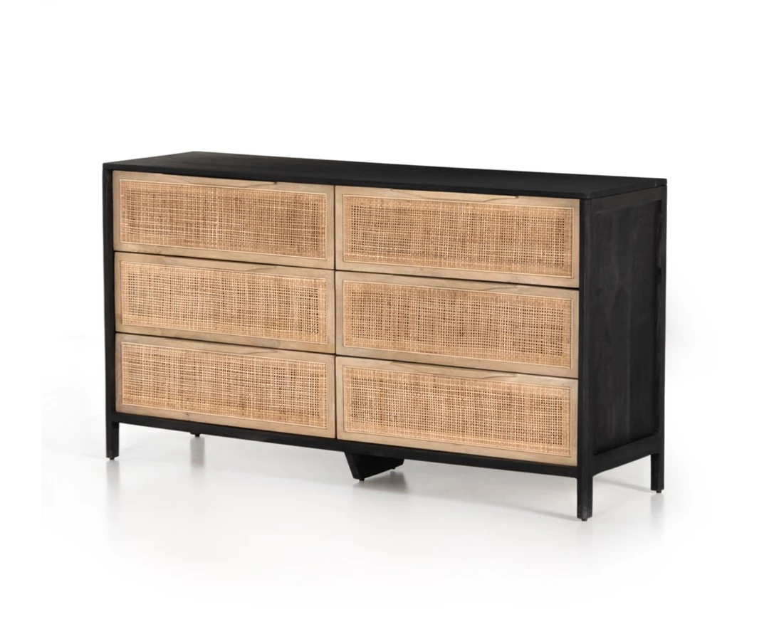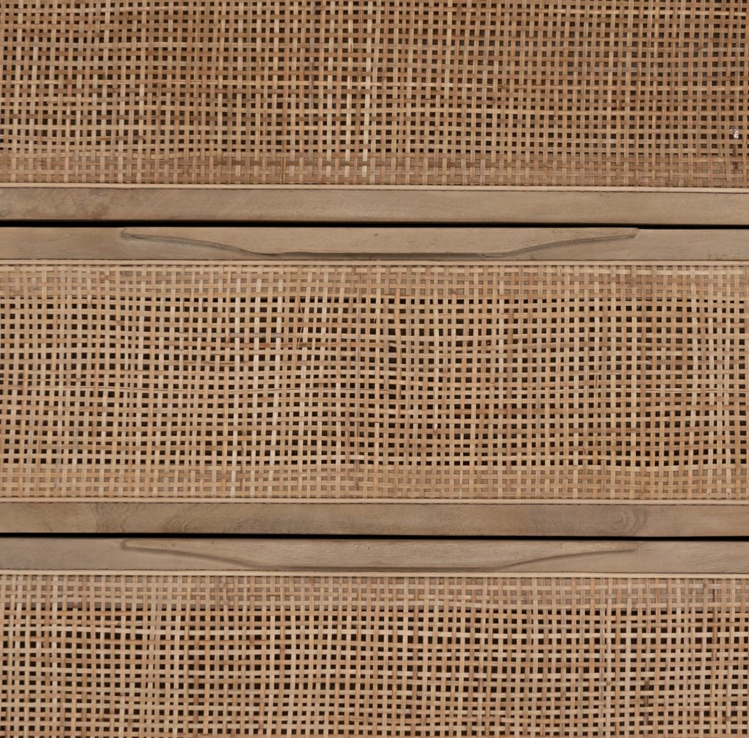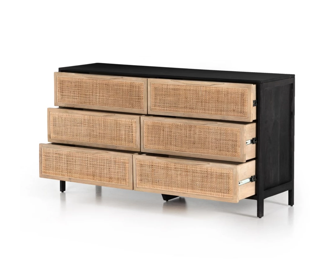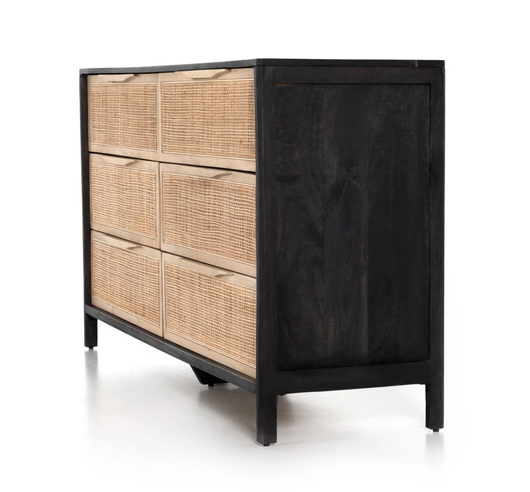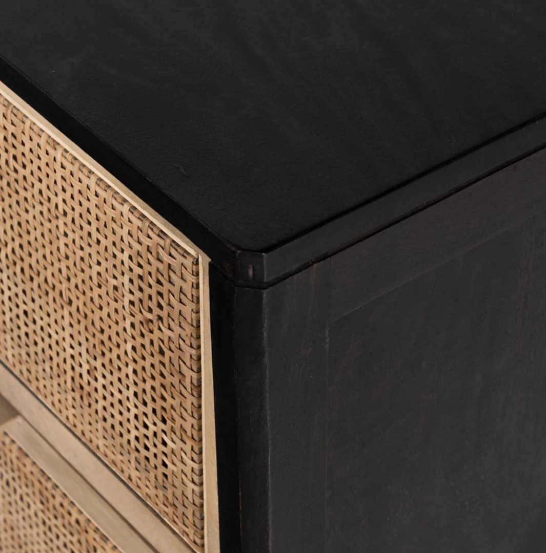 Black-washed mango encases six spacious drawers of woven cane, for a textural look with eye-catching contrast.