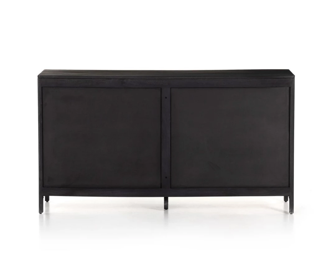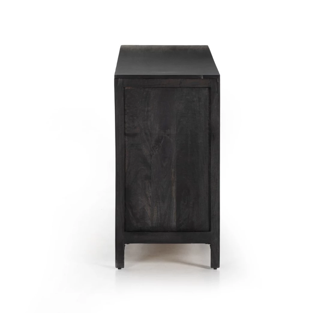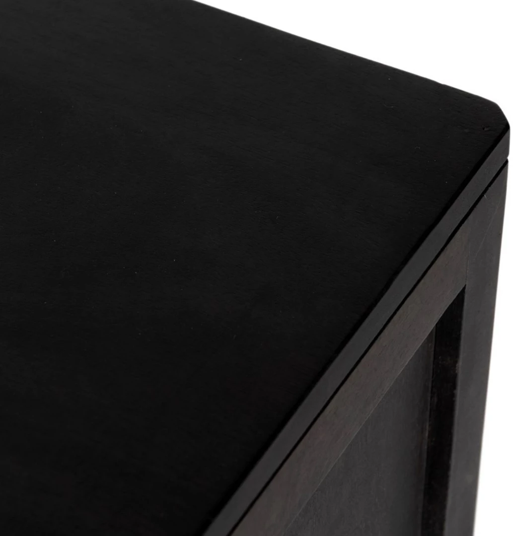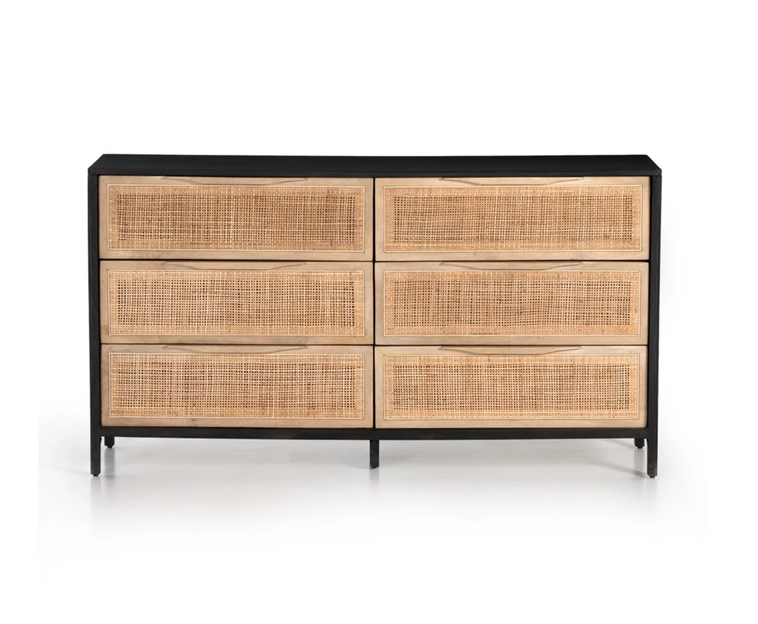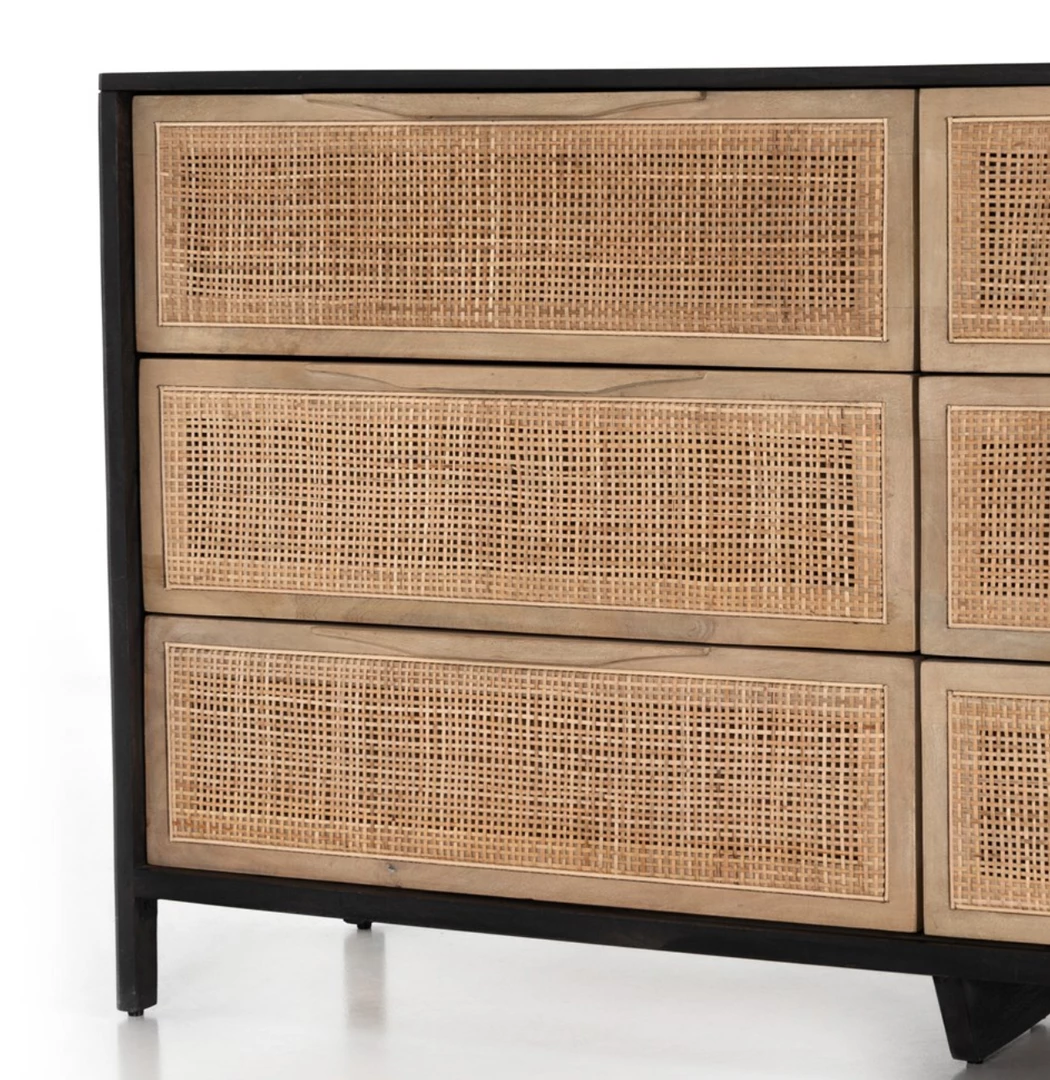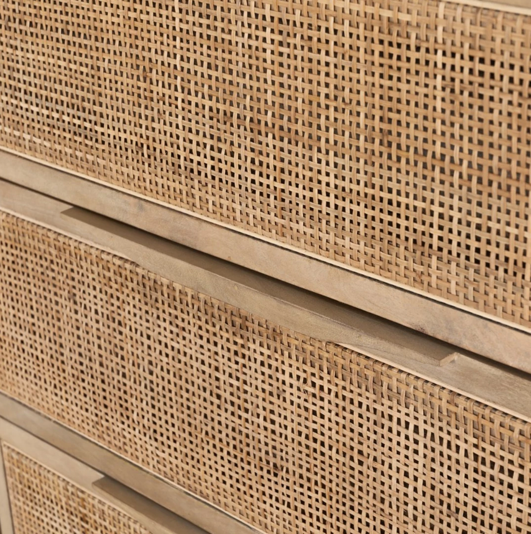 Black-washed mango encases six spacious drawers of woven cane, for a textural look with eye-catching contrast.