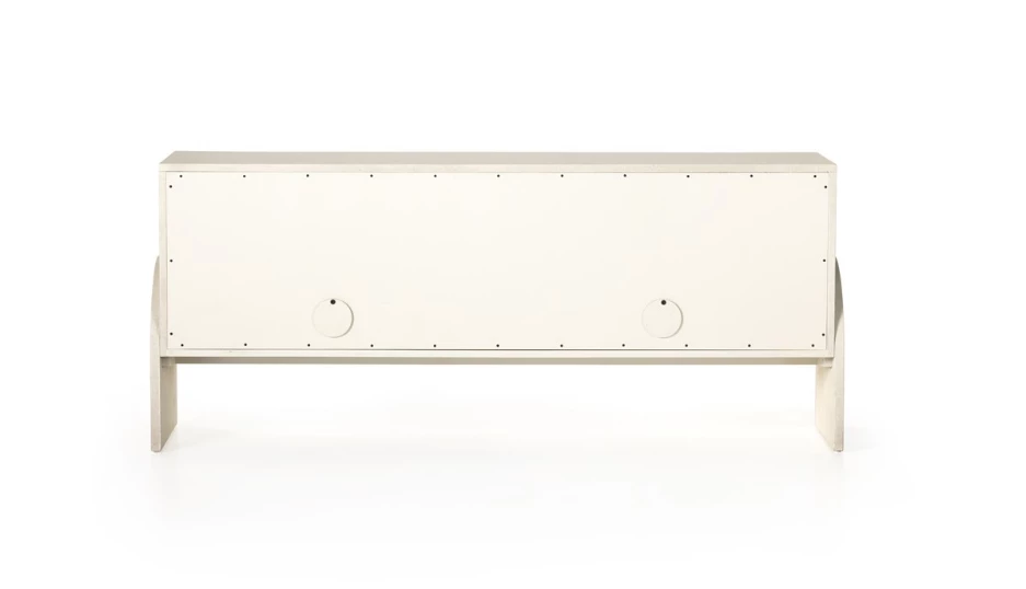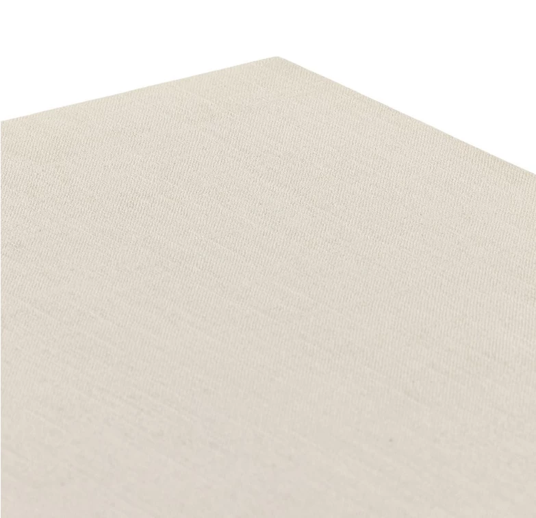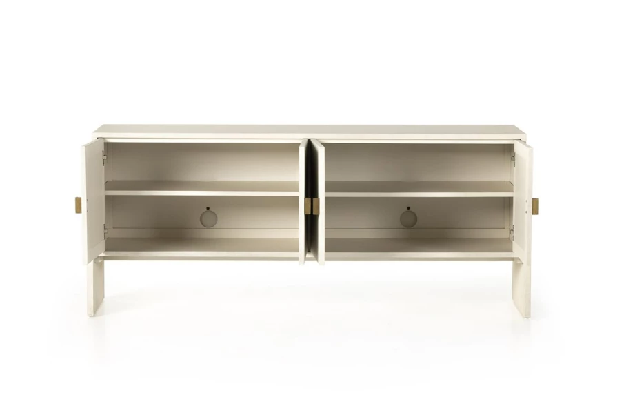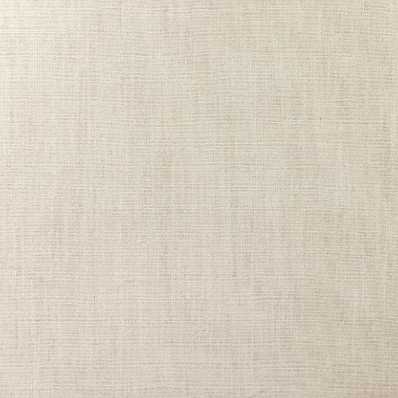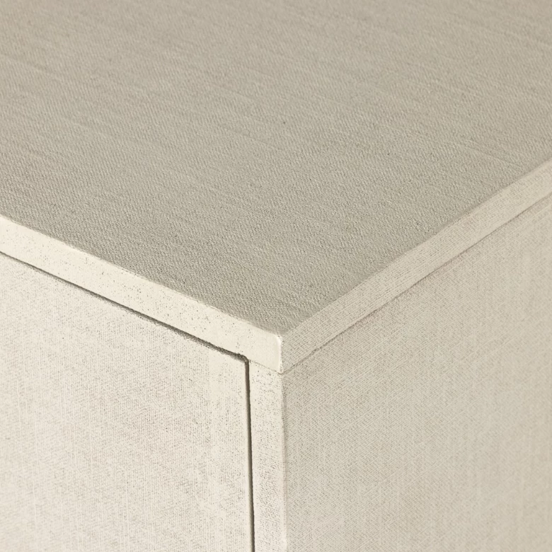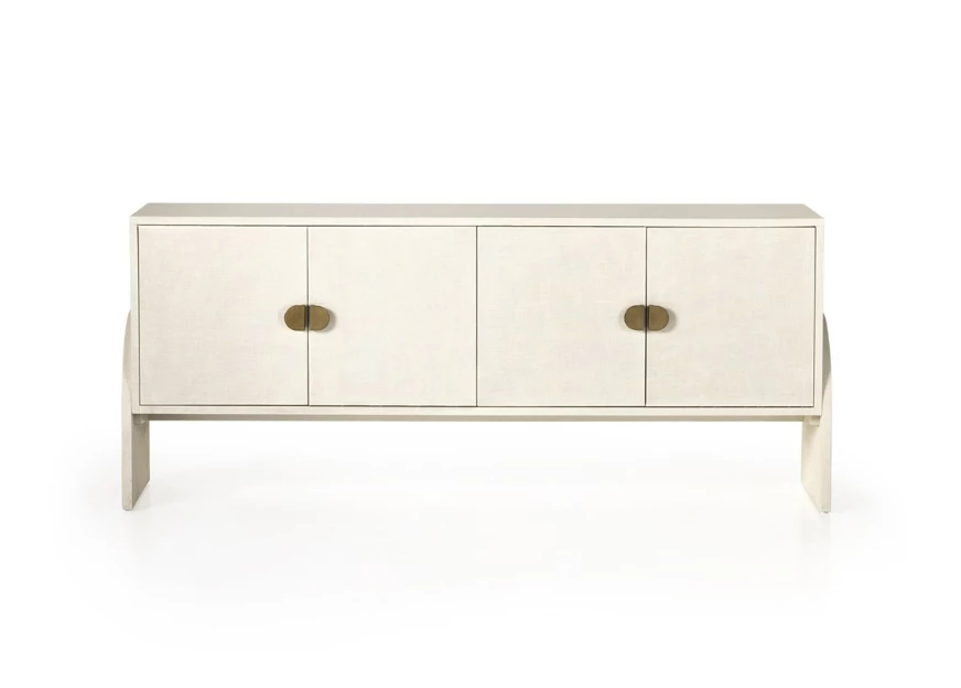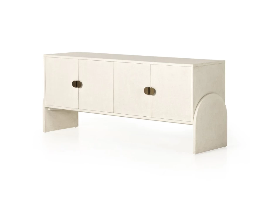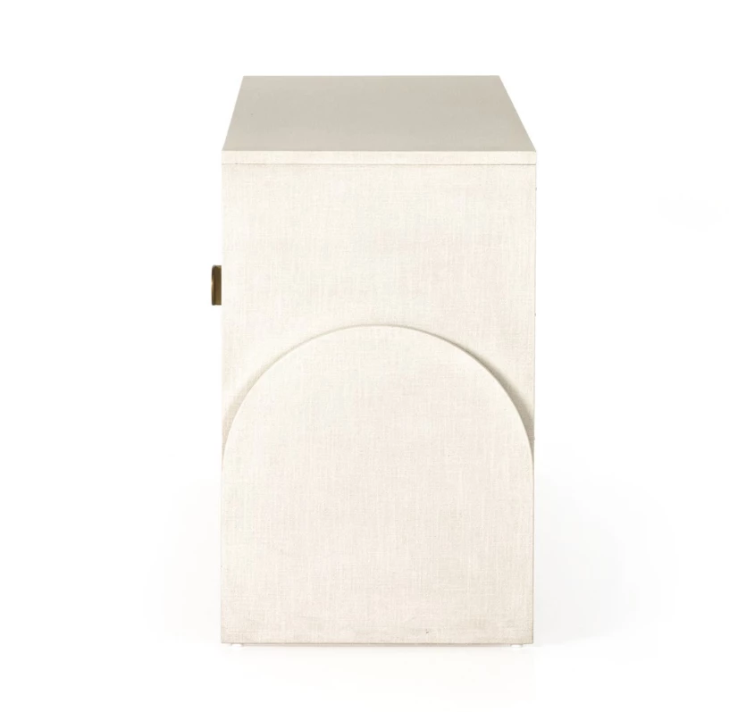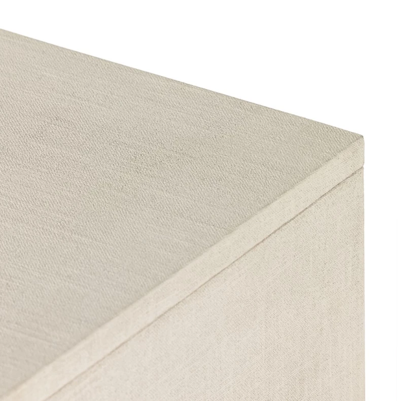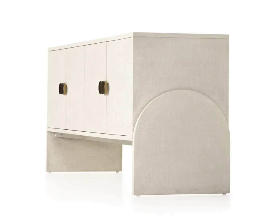 Talk about novelty. Made from painted linen in a light ivory, arched legs soften otherwise clean, modern shaping. Finished in an antique brass, half-moon iron hardware completes the look. Dual rear cutouts for cord management.