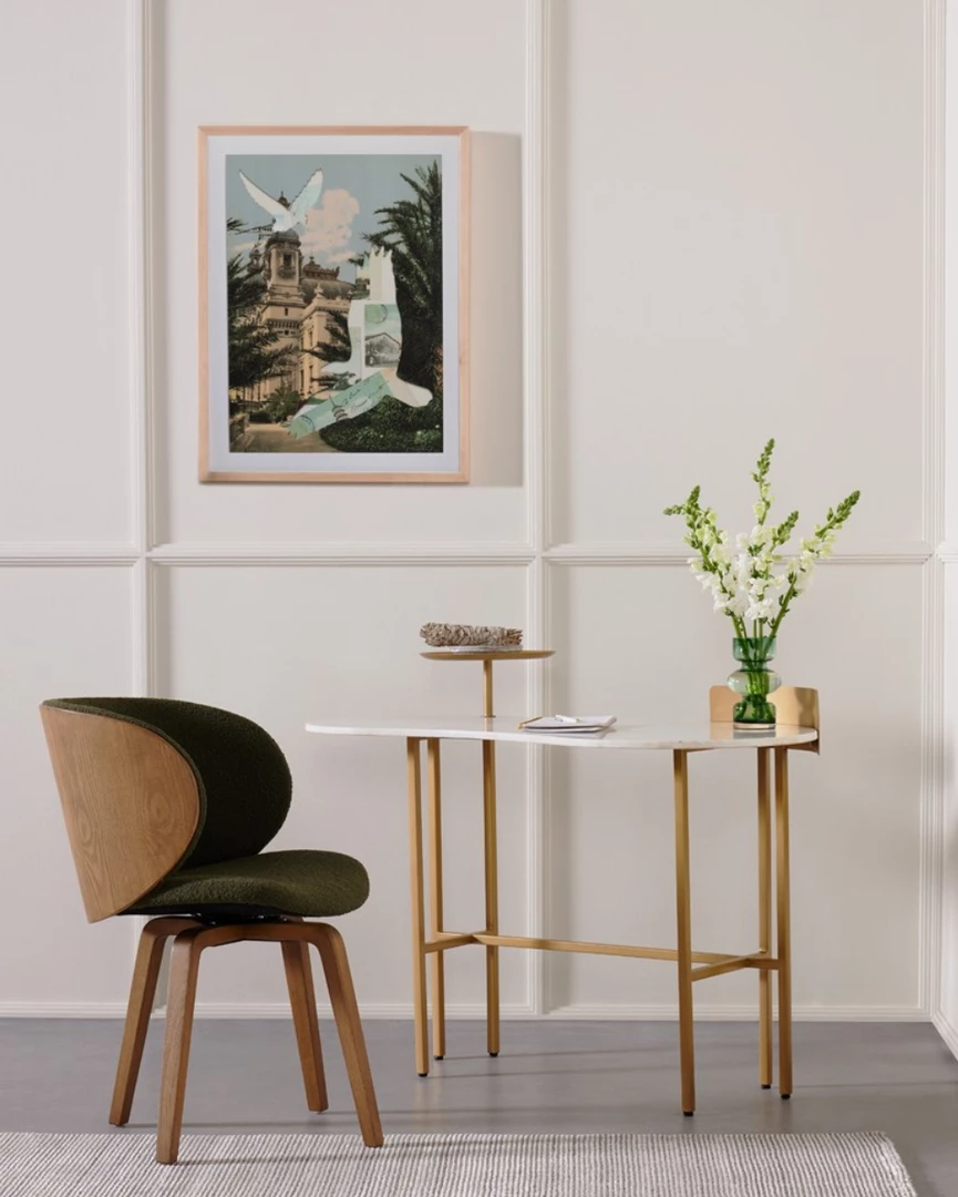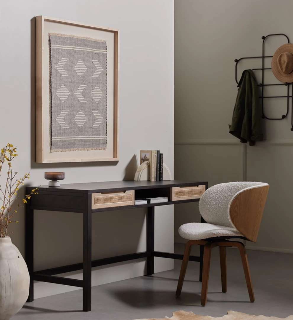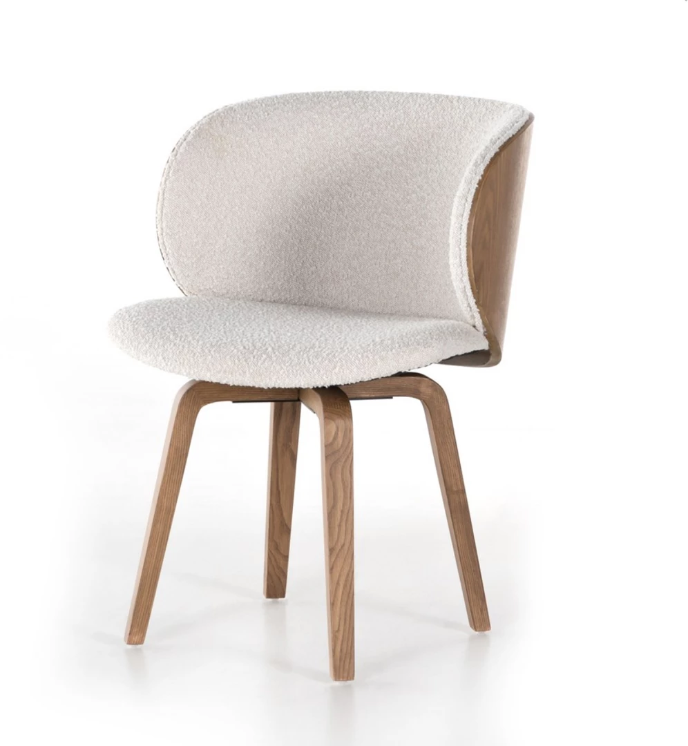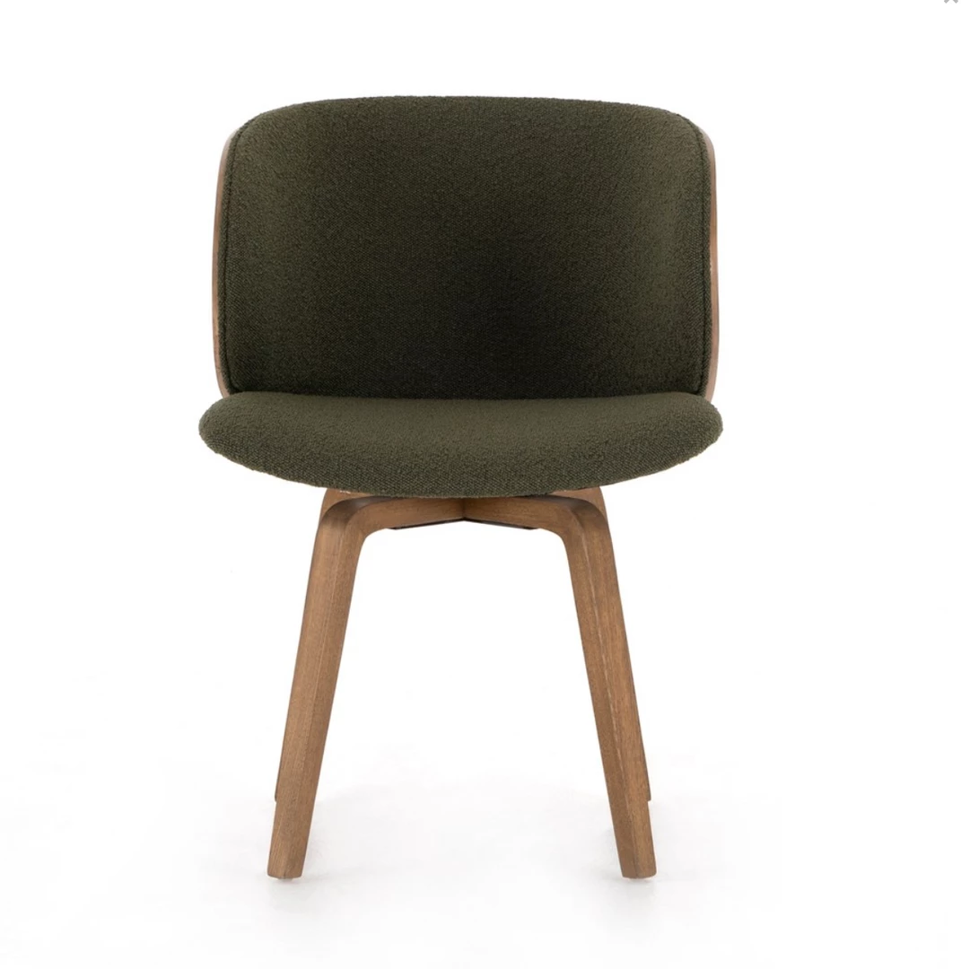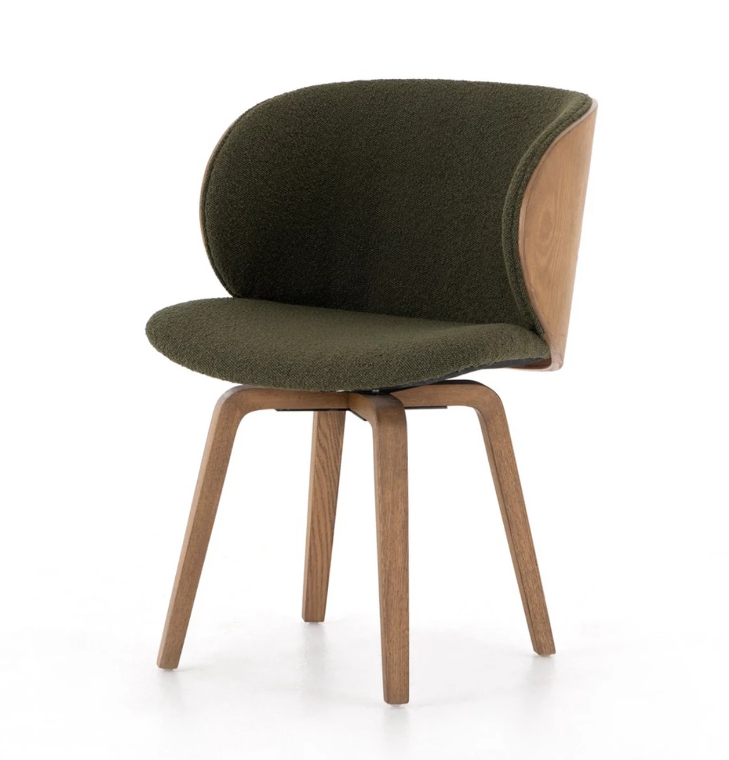 Style on a swivel. Intriguingly shaped legs of solid ash support a bentwood-back frame of ash veneer, with visible natural graining for extra effect. Seat upholstered in a textural emerald boucle, for plush comfort and vintage vibes alike. Stationary swivel allows for styling in office or dining room. Pairs well with the Aspen Desk and Desk Systems.