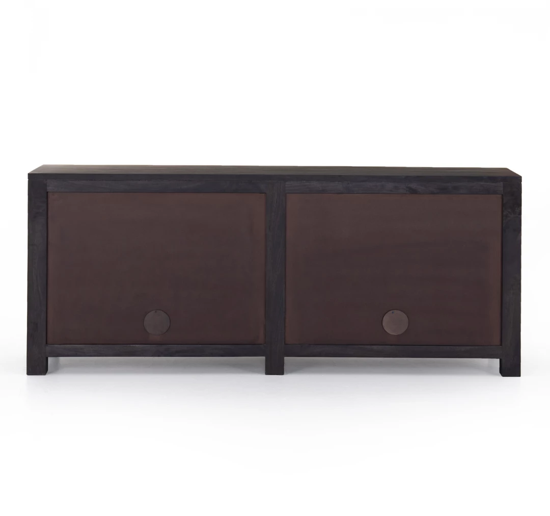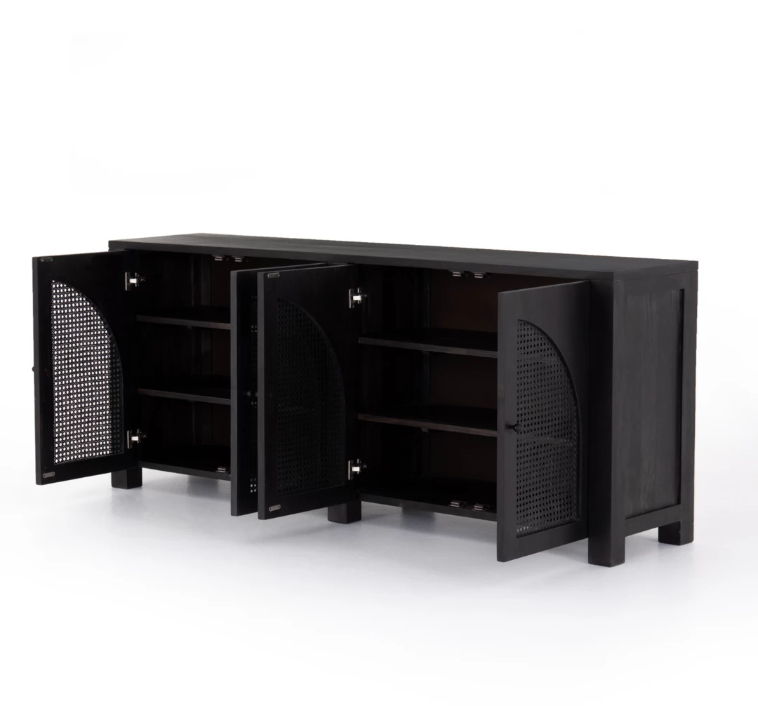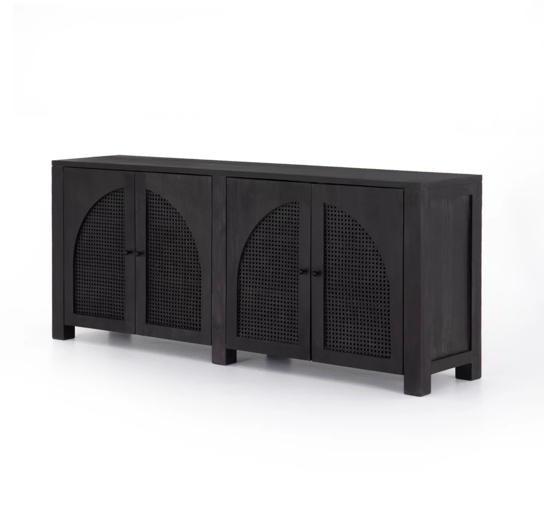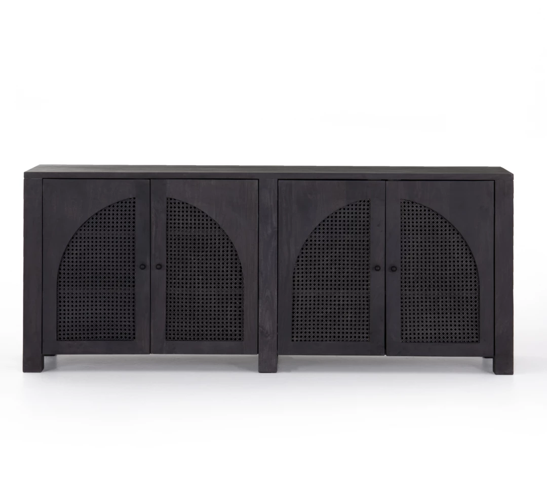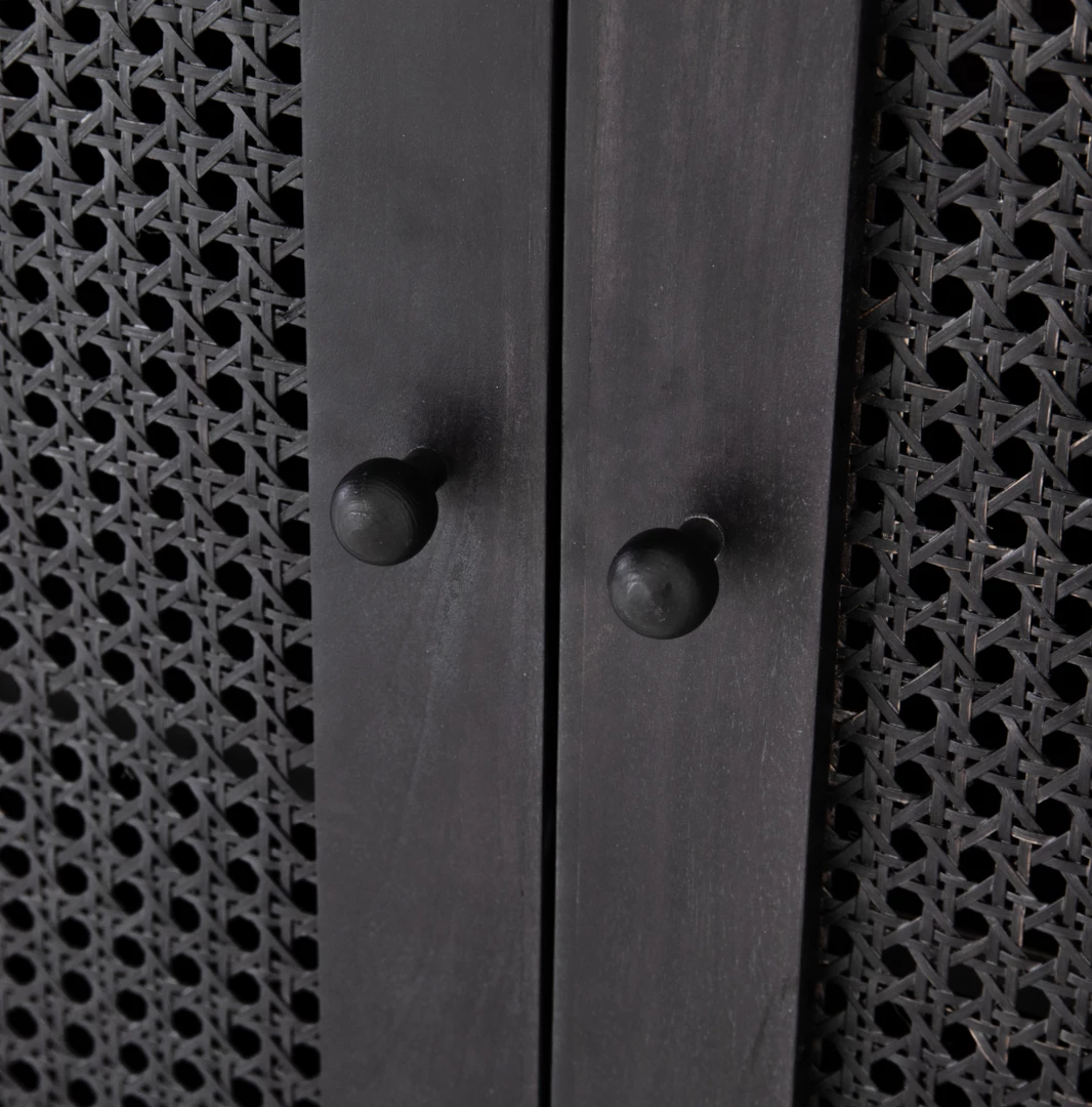 Grand in scale and presence. Black-washed mango encases arched cane door panels featuring black-finished iron hardware, meeting a forward-thinking material mix with monochromatic vibes.