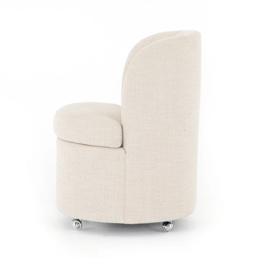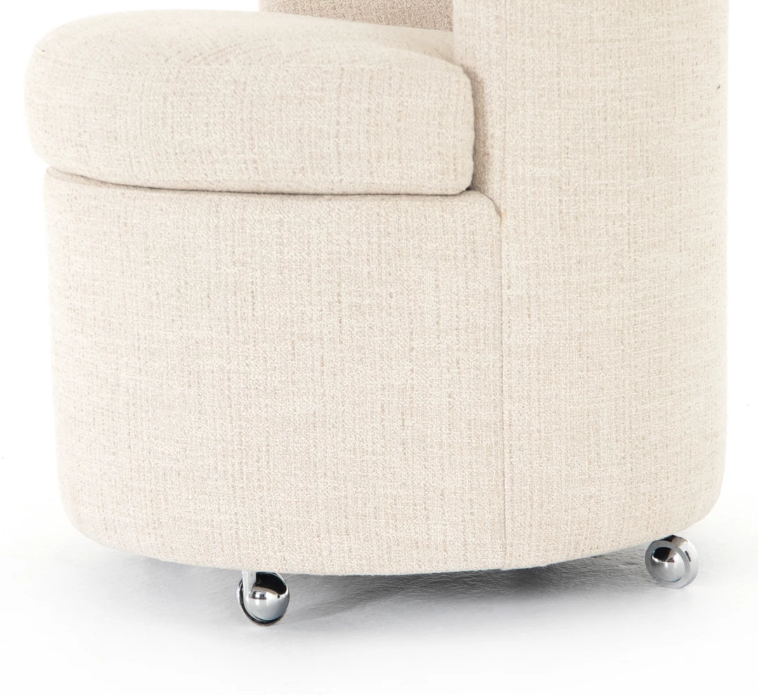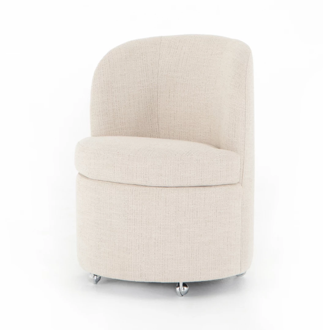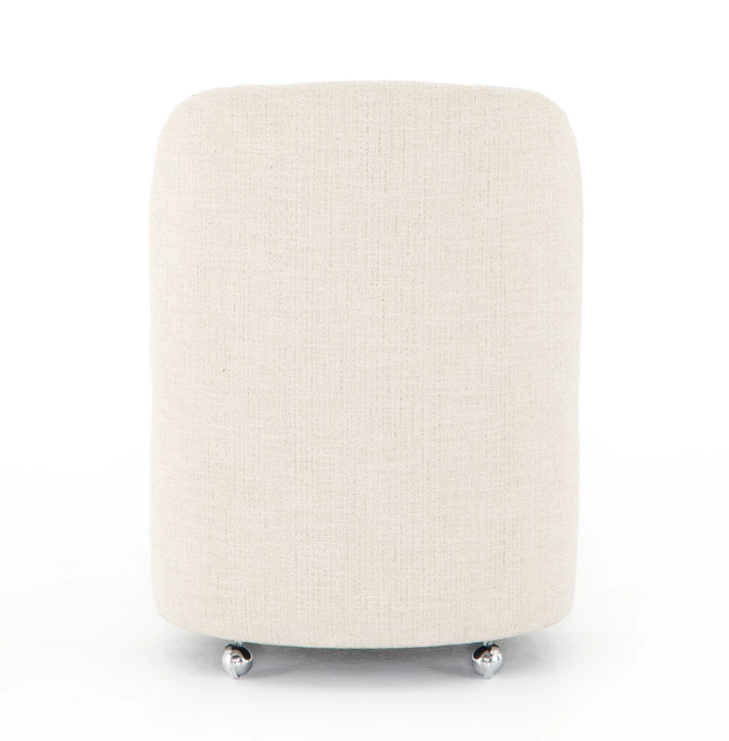 Bring an elegant air to the dining table. Shapely drum-style seating, with cream-colored upholstery tailored to a T, plus chrome casters for easy movement.