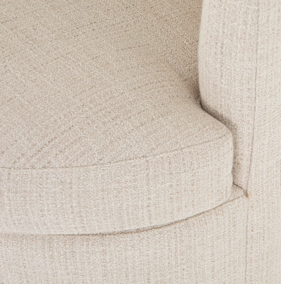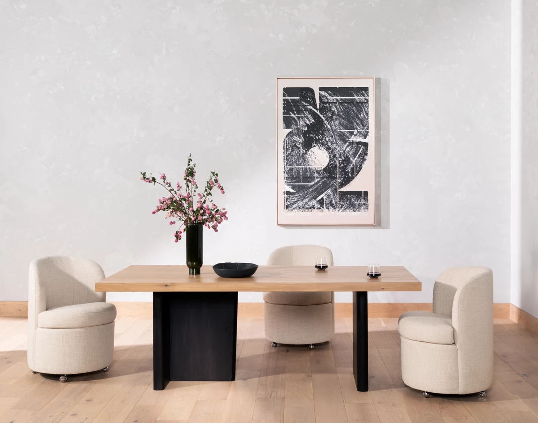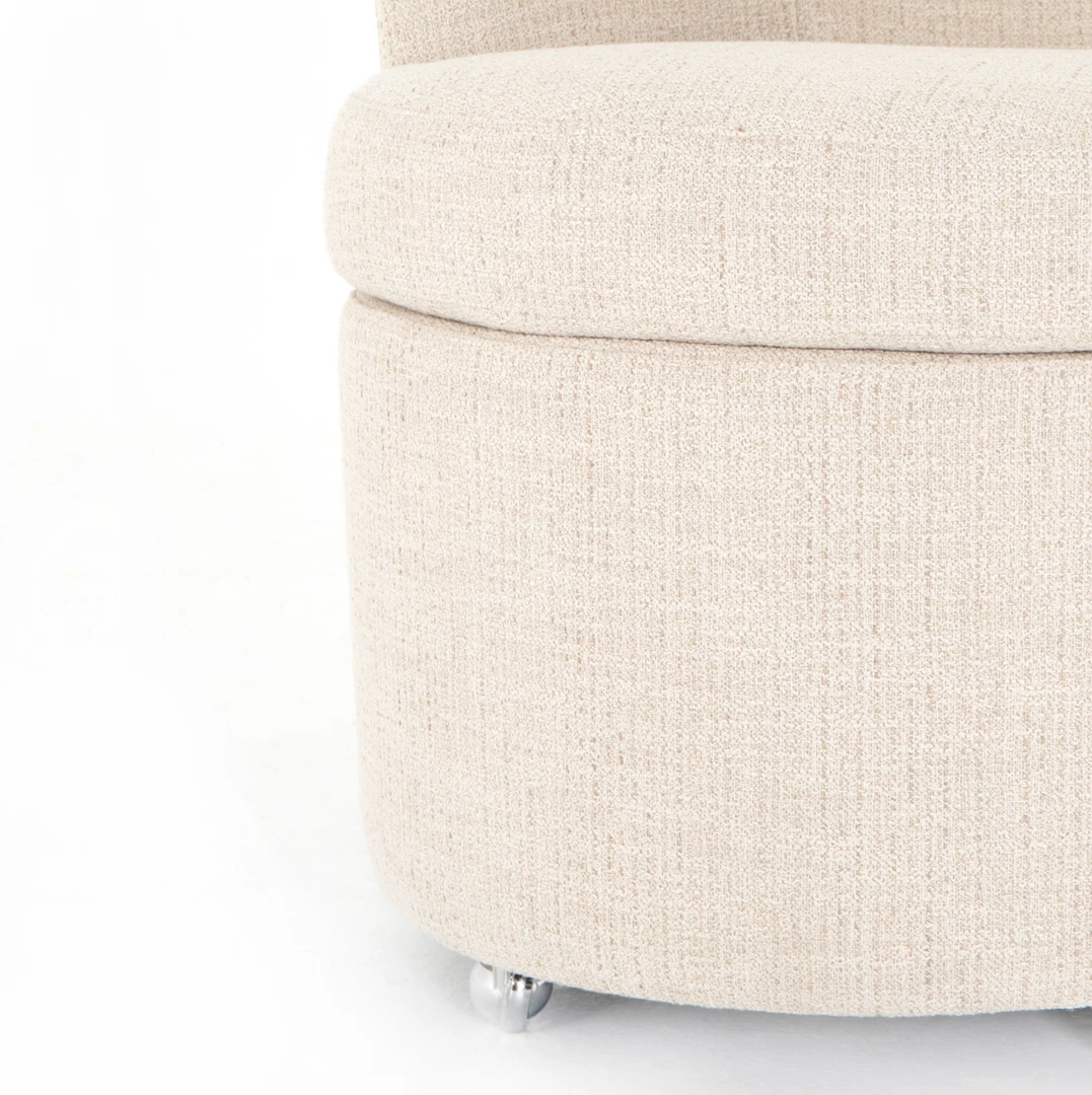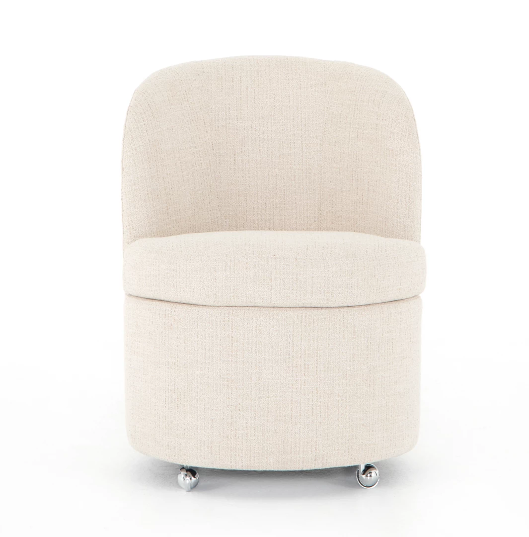 Bring an elegant air to the dining table. Shapely drum-style seating, with cream-colored upholstery tailored to a T, plus chrome casters for easy movement.