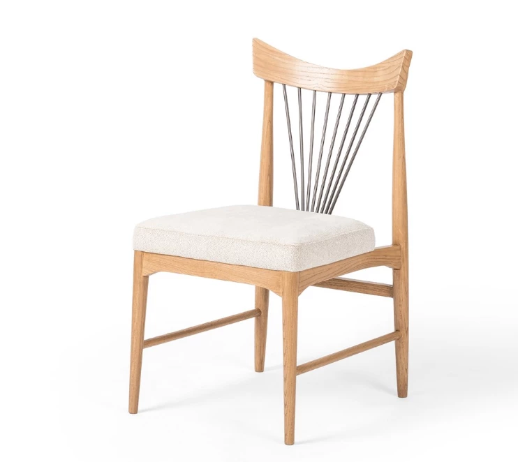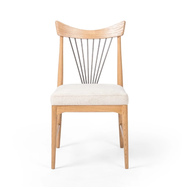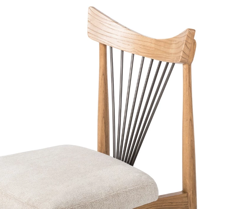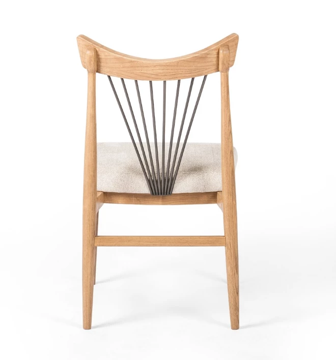 Light, honey-finished oak forms a shapely wing-style frame inspired by mid-century décor. Rear spindles of gunmetal-finished iron add unique intrigue, while upholstered seating of high-performance fabric meets comfort with practicality.