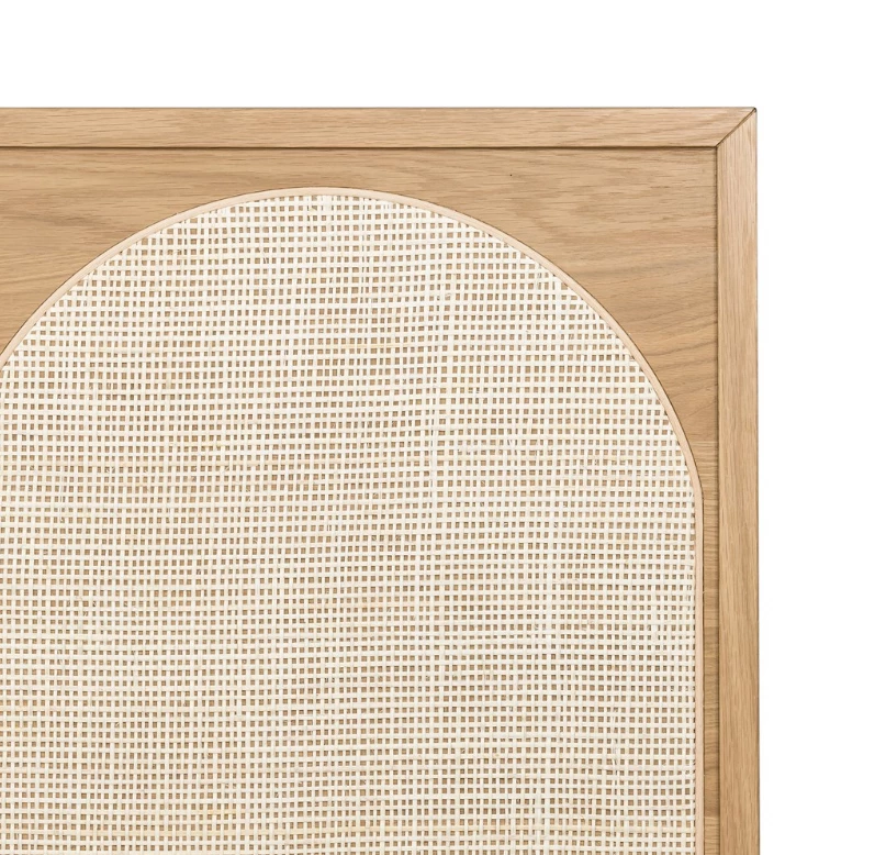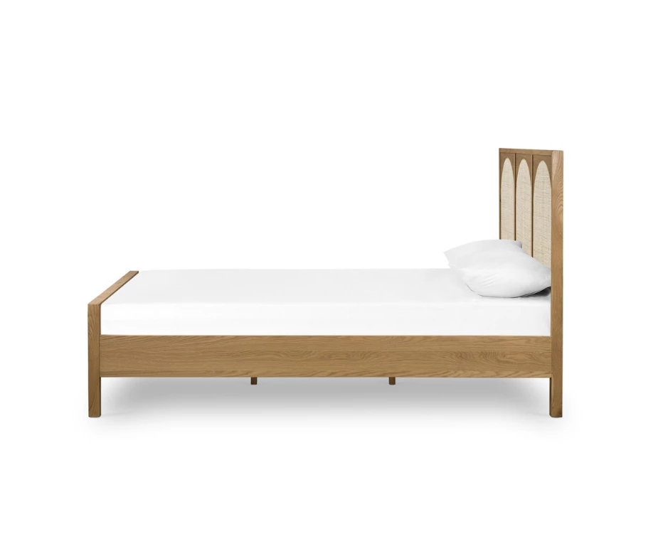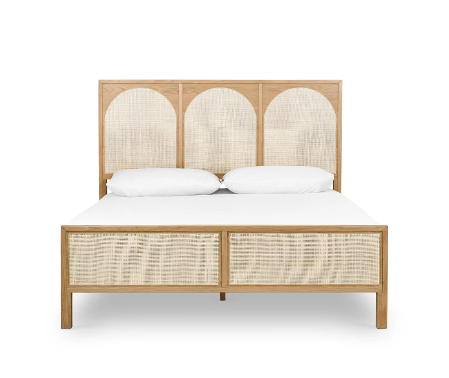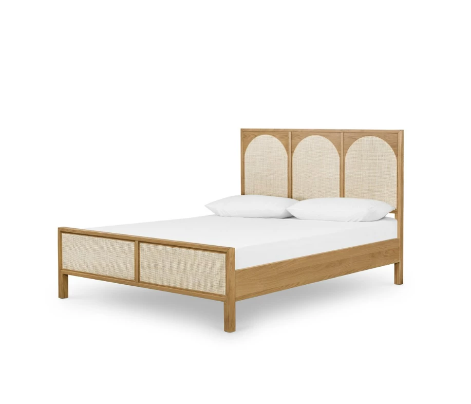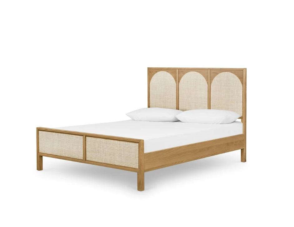 Au naturale. A light oak bed frame features wood-backed cane arches and panel footboard detailing, for a soft, neutral look with lasting modernity.