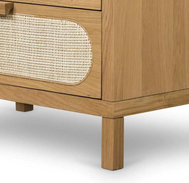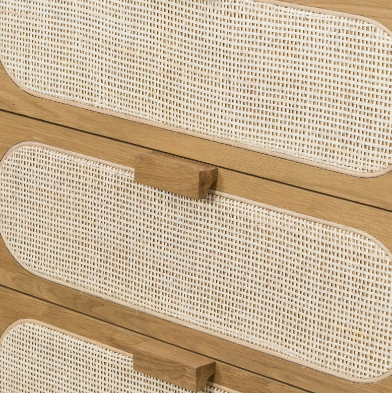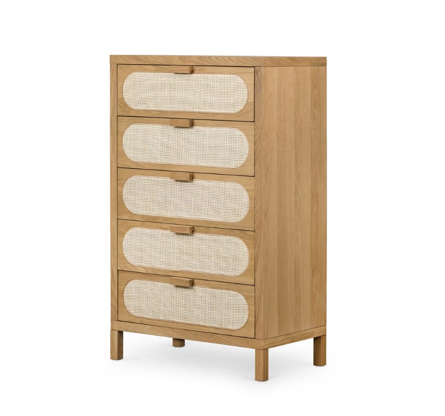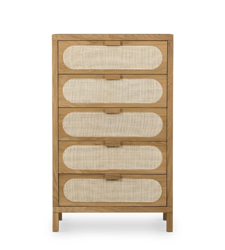 Au naturale. Honey-finished oak welcomes five spacious drawers with wood-backed cane paneling, for a soft, neutral look with lasting modernity.