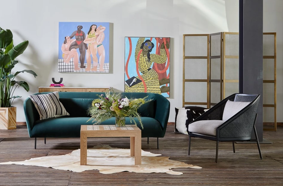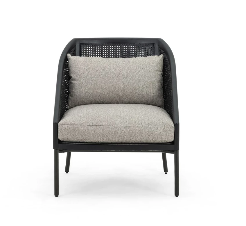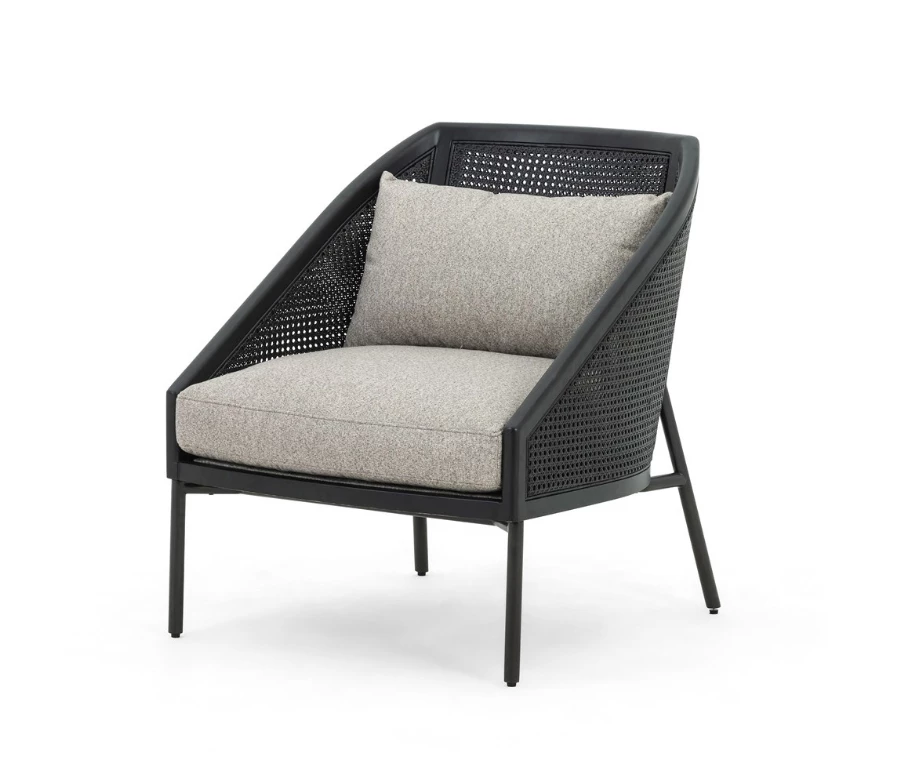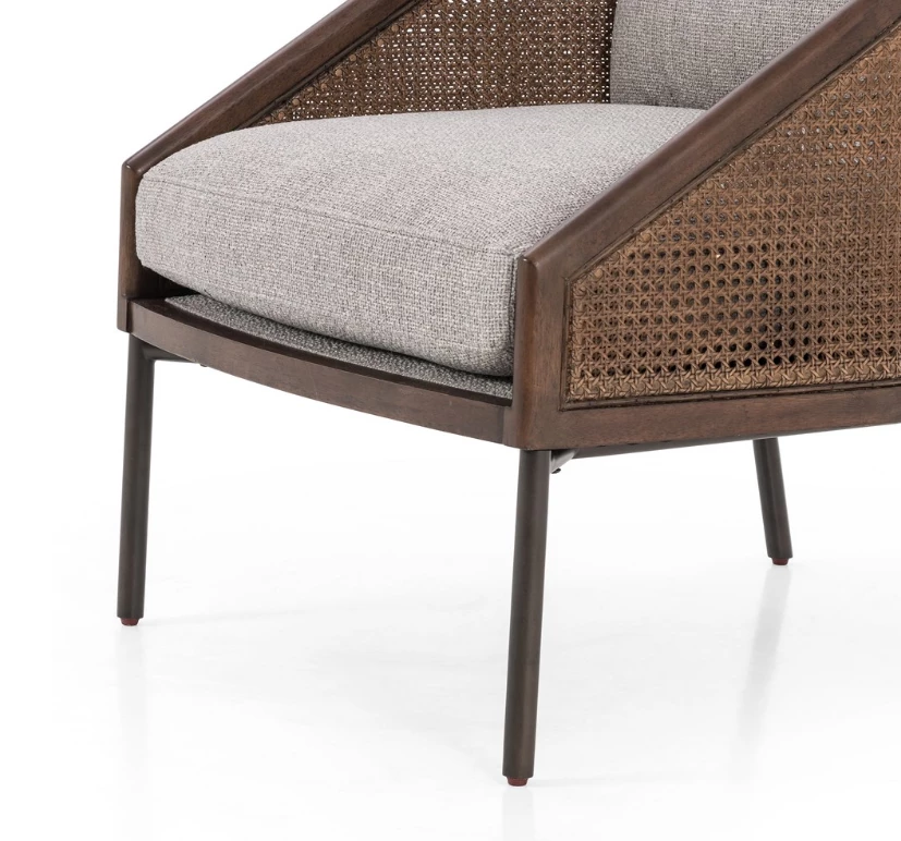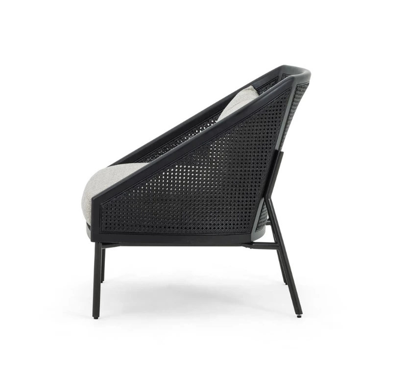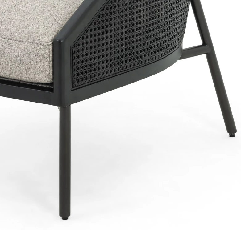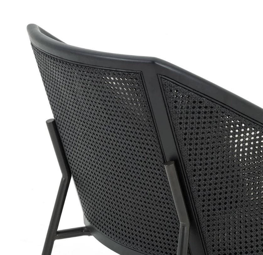 The right angle. A modern, material-driven take on a classically sleek silhouette, slim iron legs and textural black rattan, framed out by solid FSC-certified rubberwood. With plush feather-blend cushioning for guaranteed comfort.