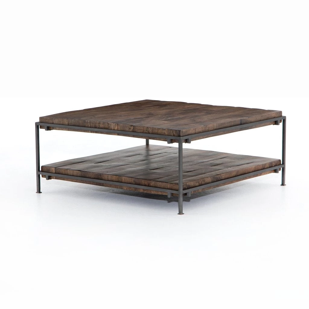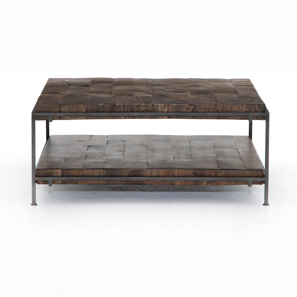 Weathered hickory hues usher warmth to the open-air coffee table. A thick slab of mango wood appears to float within its slim, gunmetal-finished squared iron frame.