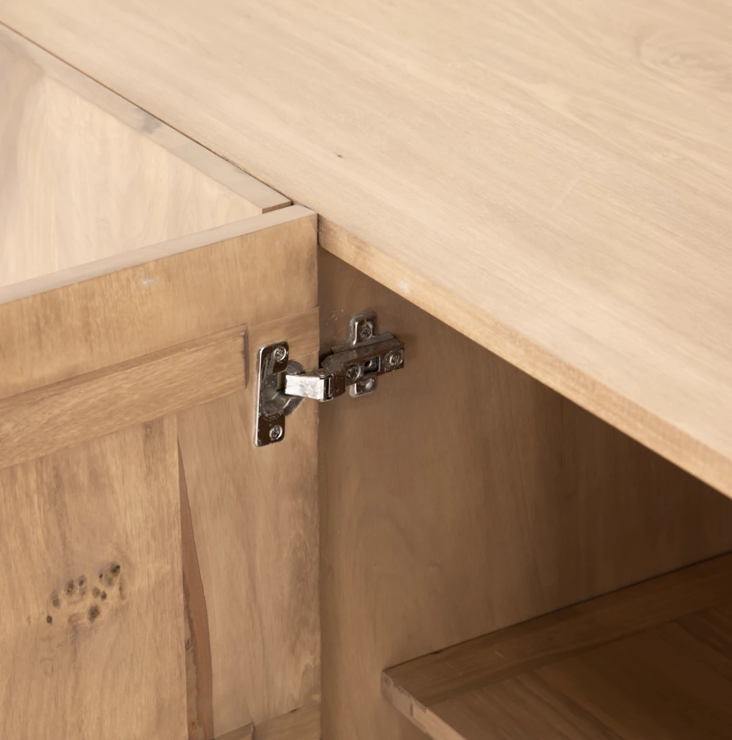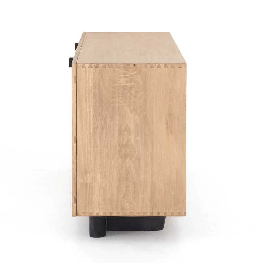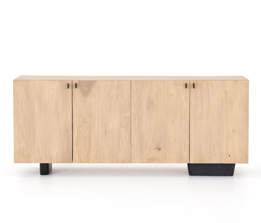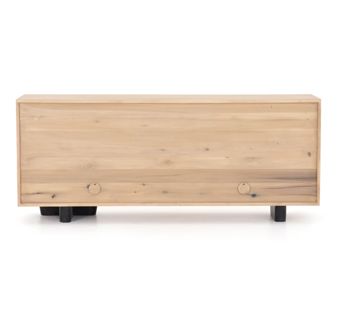 Eighties-inspired styling with a clean Scandinavian spirit. Light, dry-washed poplar forms a tailored silhouette, with black poplar legs and hardware providing eye-catching contrast. Spacious interior for storage of cookbooks, serveware, table linens, and more.