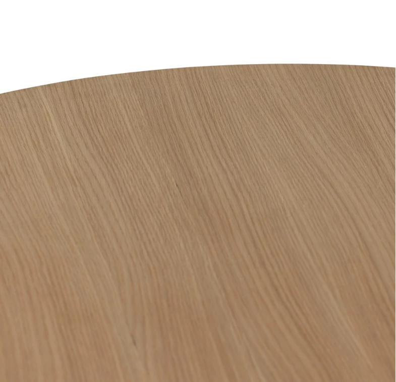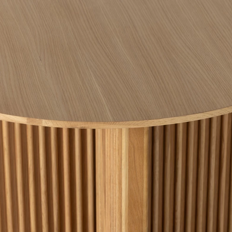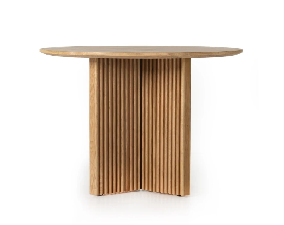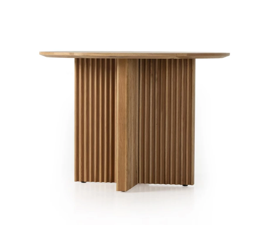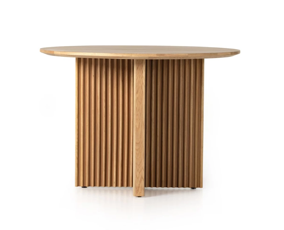 Heavy reeding and a cross-style base bring a shapely, high-texture look to a simple rounded oak tabletop. Seats four comfortably.
