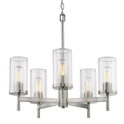 The Kate collection is versatile and transitional in style. Classic silhouettes are perfectly matched with clean, modern lines for a mixture of form and function. Bright bulbs shine within ribbed clear glass shades. The linear texture, made by a glass-blowing technique, creates the optical illusion of distortion. The vertical lines in the glass provide gentle diffusion while playfully refracting light. This 5-light chandelier creates a stylish focal point and is comfortably sized for intimate dining and living areas.