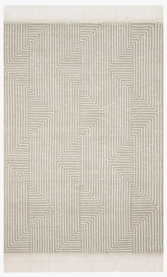 The Newton Collection for Magnolia Home by Joanna Gaines is hand woven by artisans in India of wool, cotton, viscose, nylon, polyester, and acrylic. Boasting a relaxed linear design with a subtly heathered backdrop, Newton creates visual interest through coils of textured yarn finished with a macramé fringe