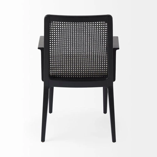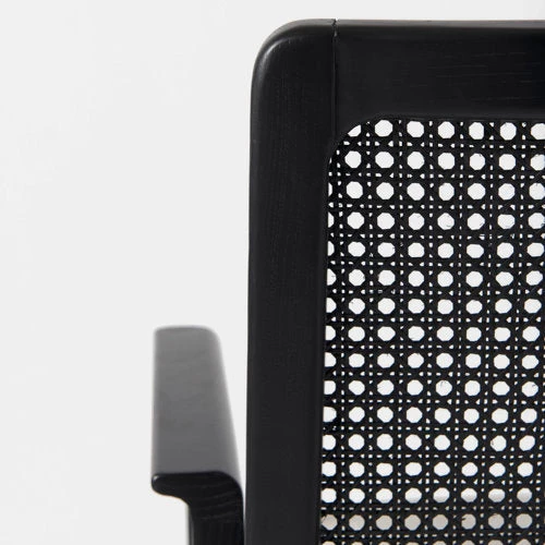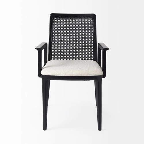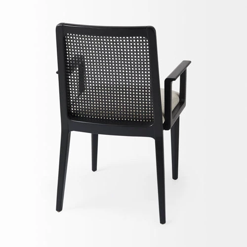 A black painted finish, spanning the wooden frame and cane back, lends a modern edge, while the creamy beige cushion softens the look and conveys a sense of comfort.