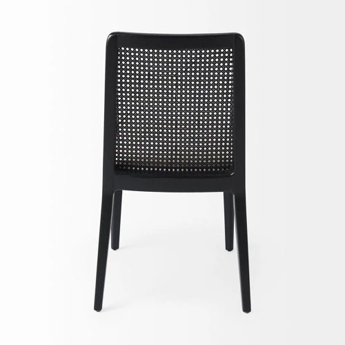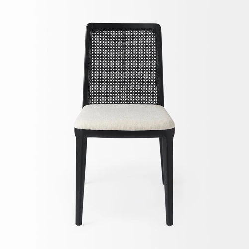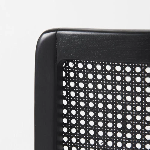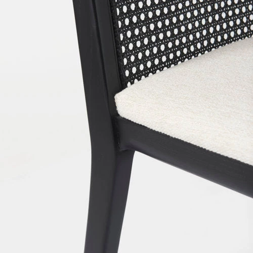 A black painted finish, spanning the wooden frame and cane back, lends a modern edge, while the creamy beige cushion softens the look and conveys a sense of comfort.