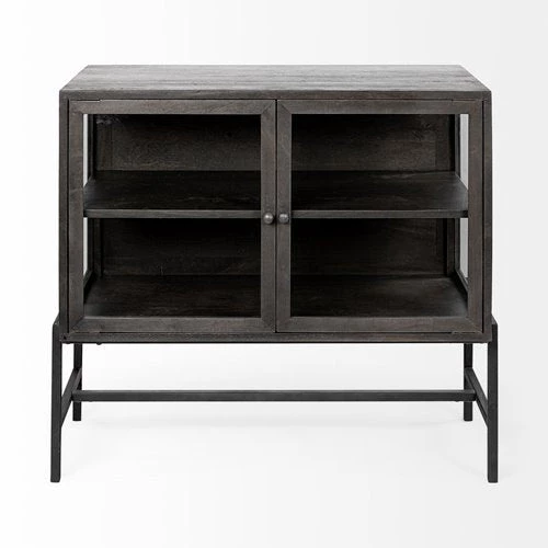 The Borro accent cabinet is beautifully crafted from solid Mango wood with two glass doors and glass side panels. It rests atop a sleek metal frame that reduces its visual bulk and enhances its airy aesthetic.Â