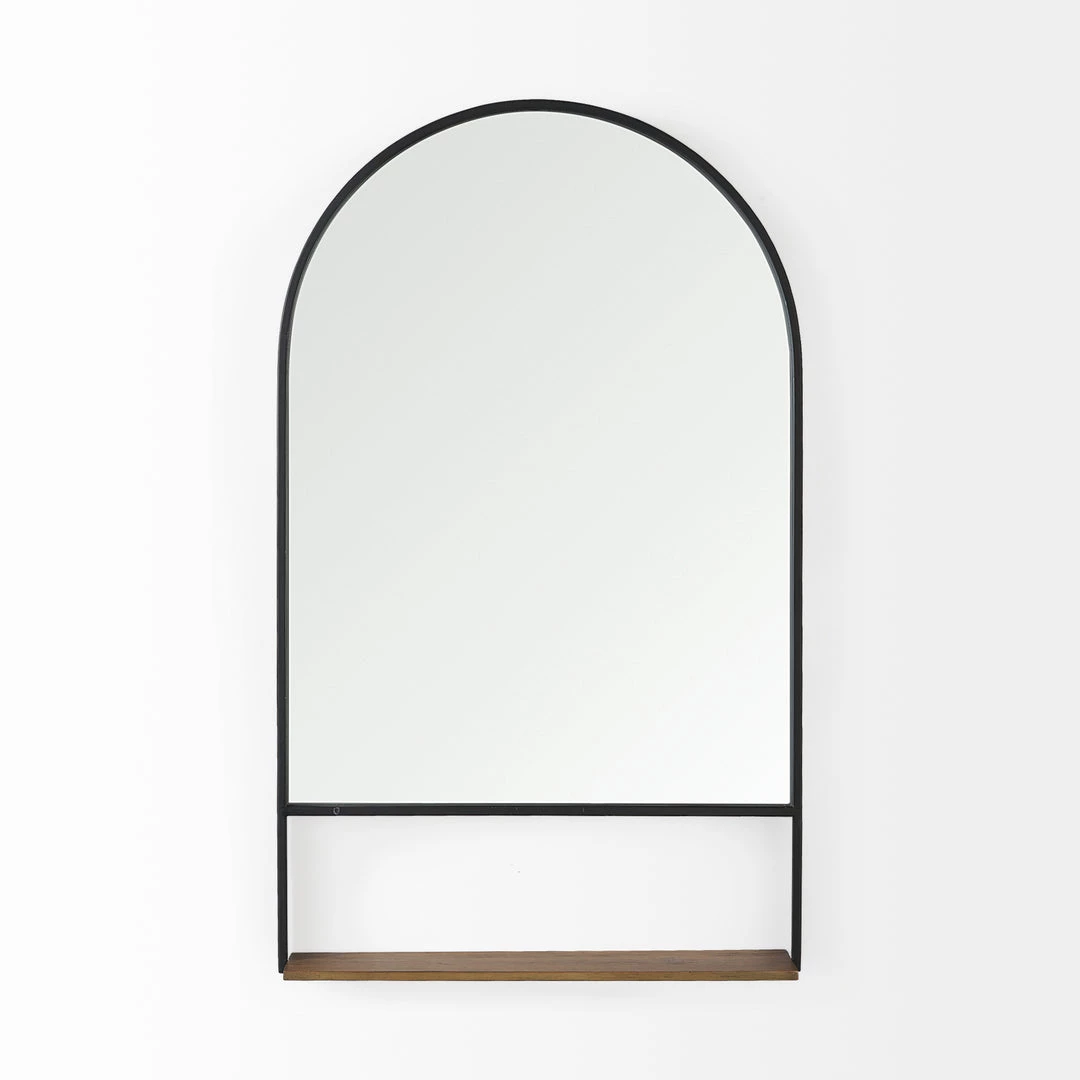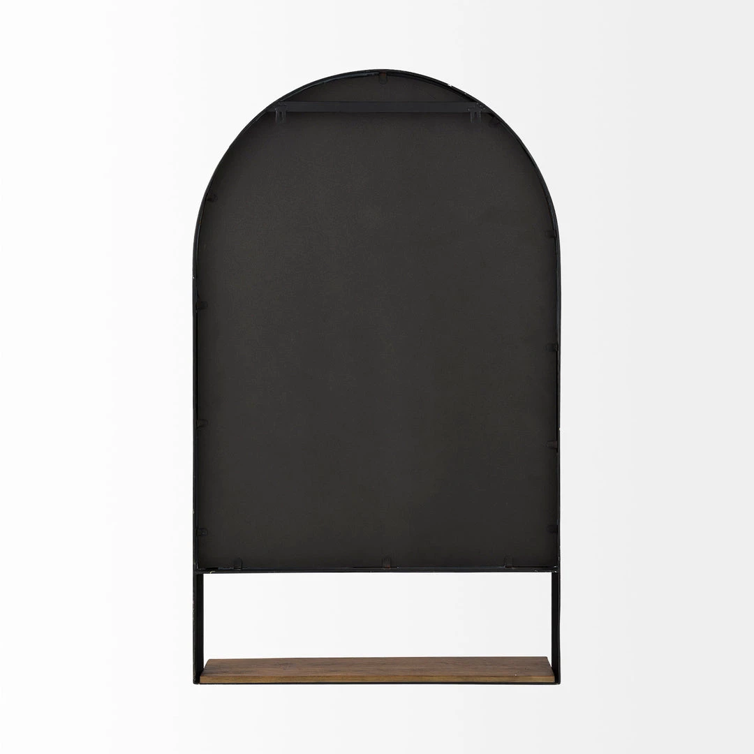 Black Metal Frame W/ Brown Wooden Shelf Arched Wall Mirror