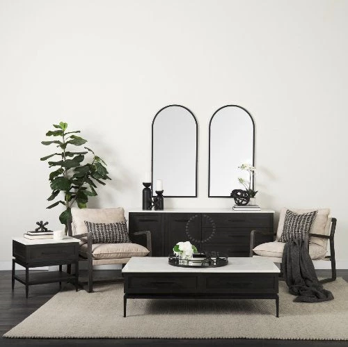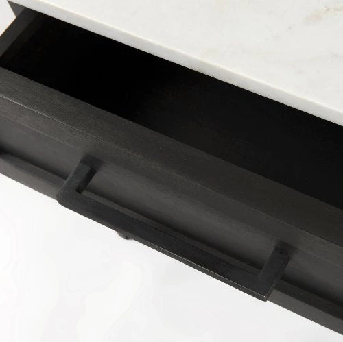 All smooth in texture, the white marble top has creamy undertones with gray and beige veining throughout, the wood has a dark brown, uniform appearance, and the metal legs have an unfussy, matte black coating. The drawer is neatly finished with a silver bar pull. *Marble is a natural material. Each piece has its own beautiful intricacies, and some may carry naturally occurring fissures. Please expect variations in color and texture.Â