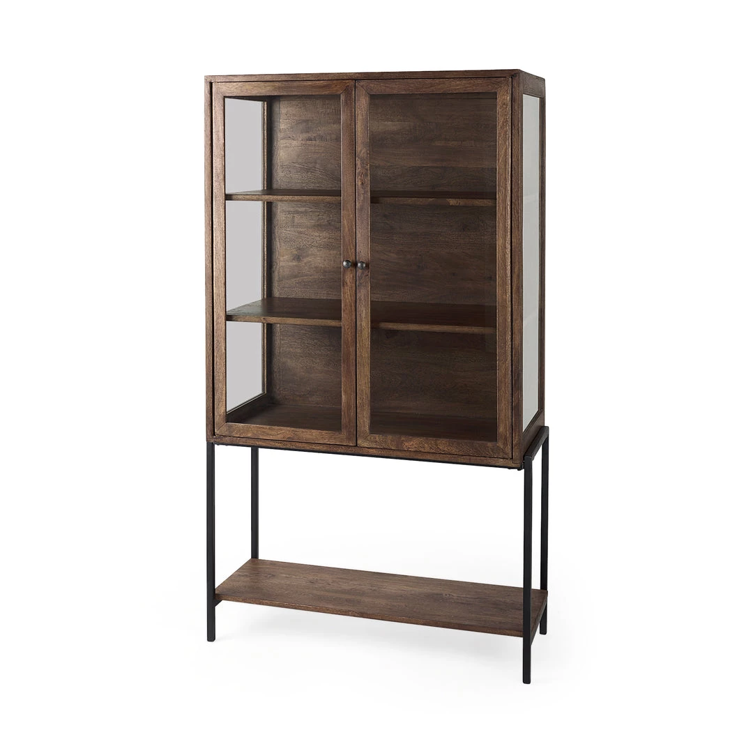 This display cabinet is beautifully crafted from solid Mango wood with two glass doors and glass side panels. It rests atop a sturdy iron frame that reduces its visual bulk and enhances its airy aesthetic.