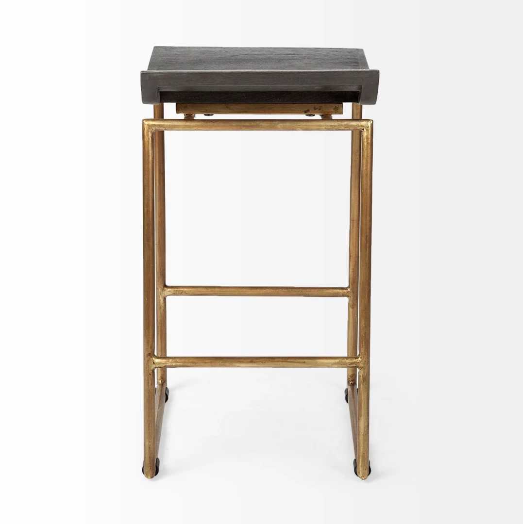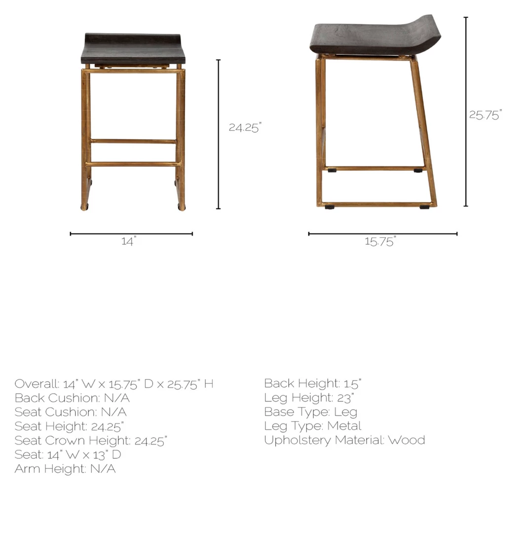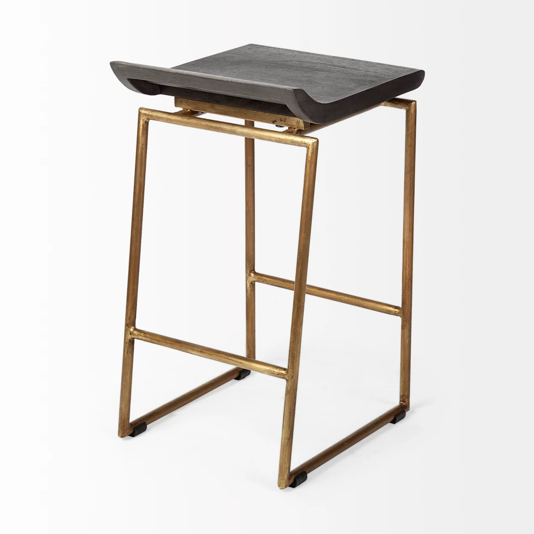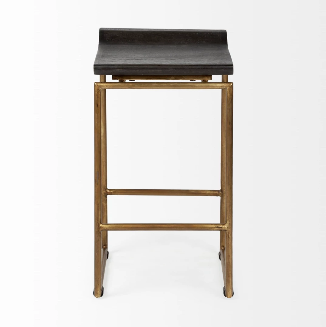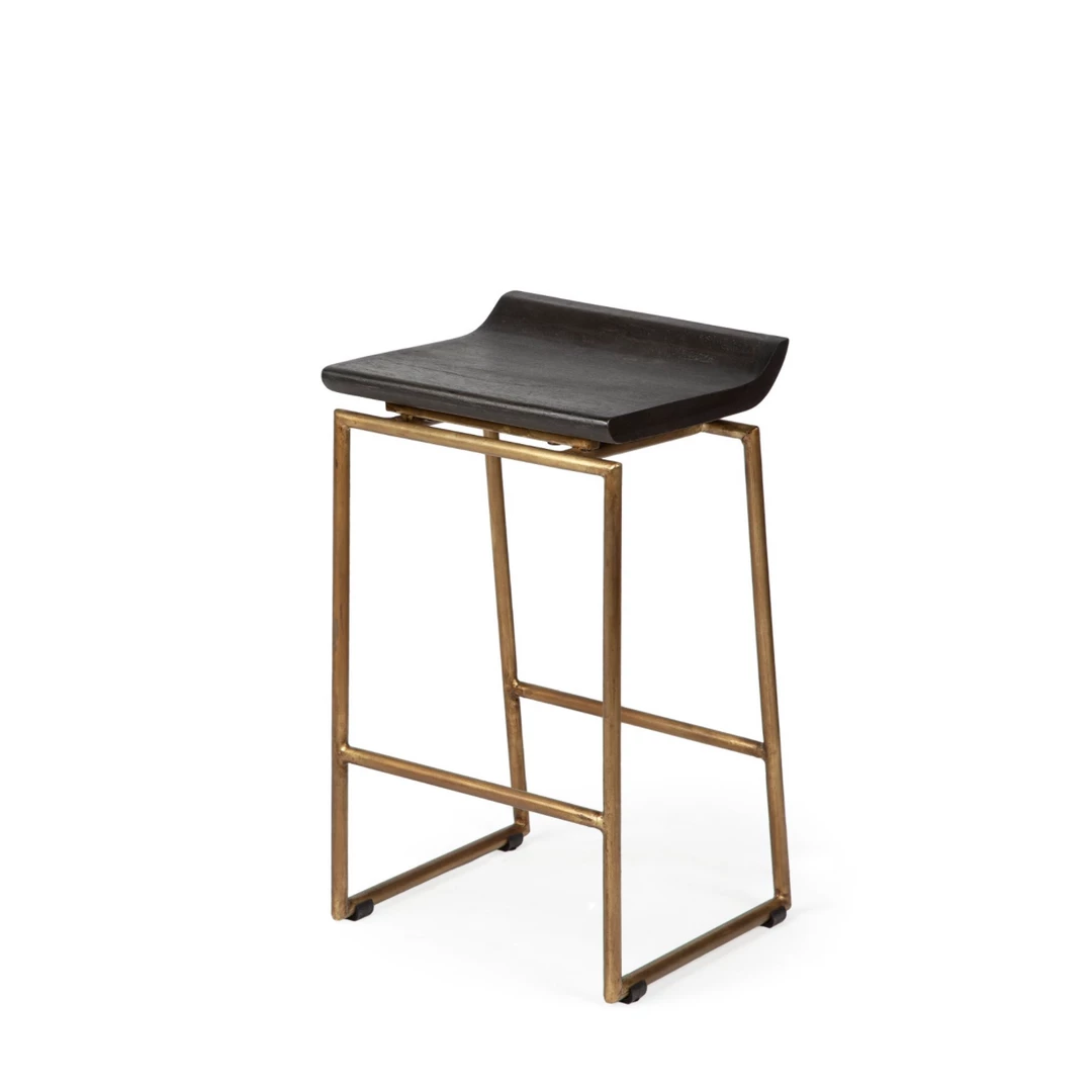The Georgia is a bar stool featuring a contoured seat made from solid Indian mango wood and finished in a dark brown polish. Featuring a frame and base crafted from solid metal, it is a sturdy, low back style counter stool with exceptional stability and balance. The seat is mounted on a sturdy, antiqued-brass toned iron frame, to ensure a comfortable seating experience. The Georgia fits well in spaces that are based on the Industrial design style.